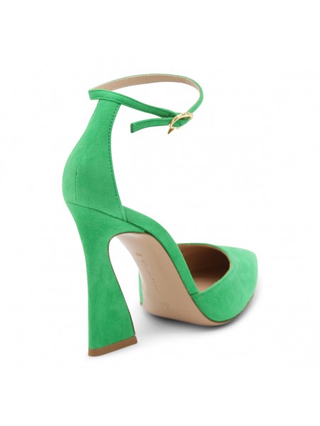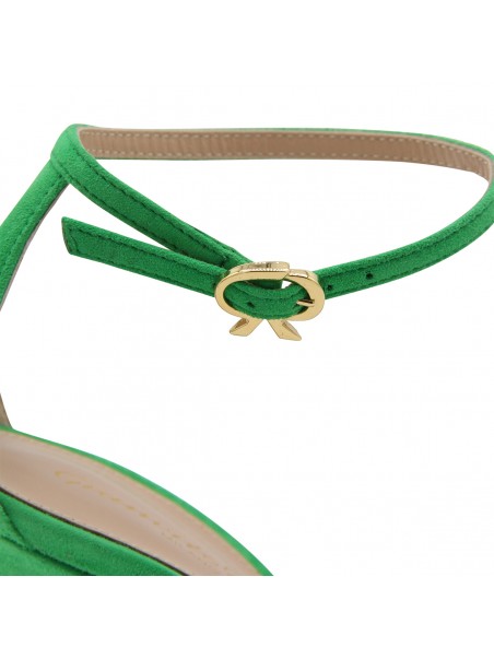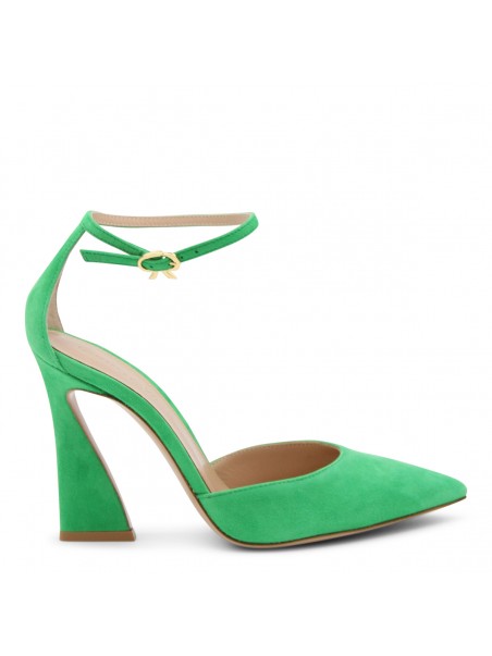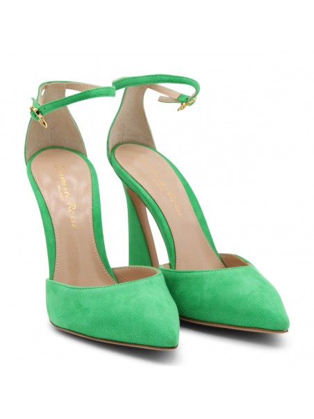 Green suede Holly pumps from Gianvito Rossi featuring pointed toe, adjustable ankle strap and sculptural heel.