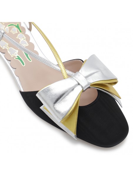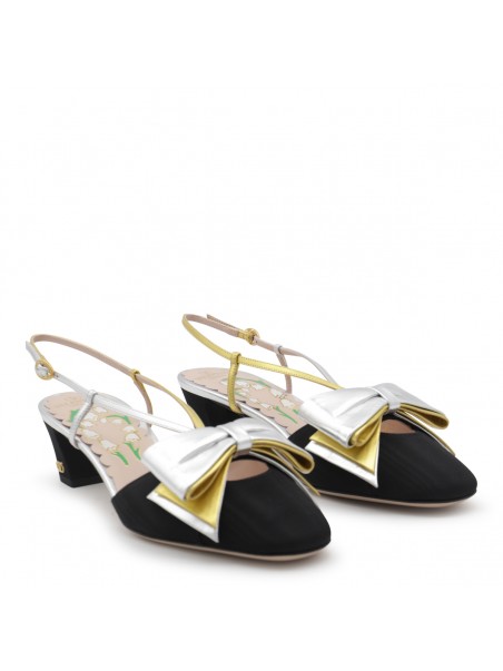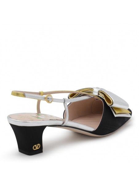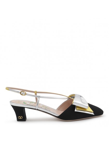 Black and gold pumps from Valentino Garavani featuring round toe, frontal bow, square heel, logo and buckle fastening.