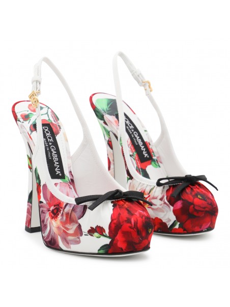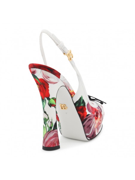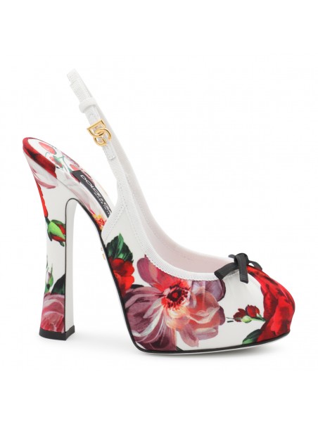White and multicolor pumps from Dolce&Gabbana featuring round toe, all over flowers print, buckle fastening and high heel.
