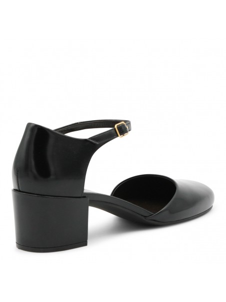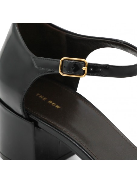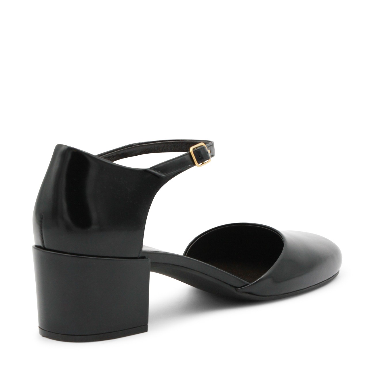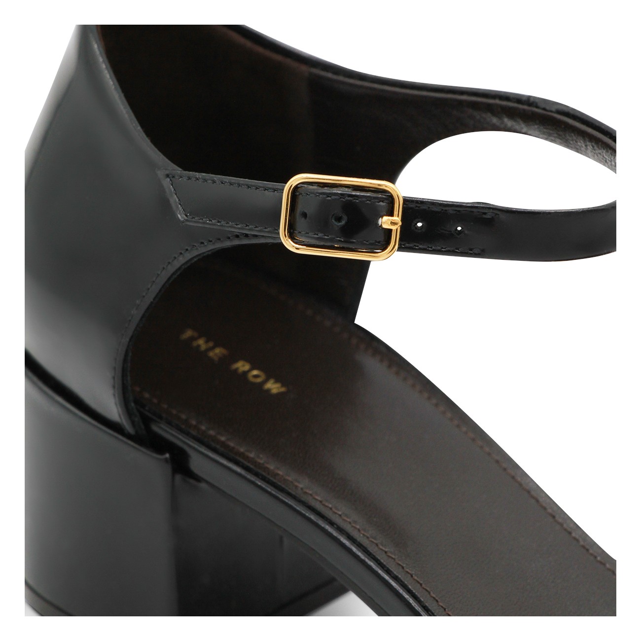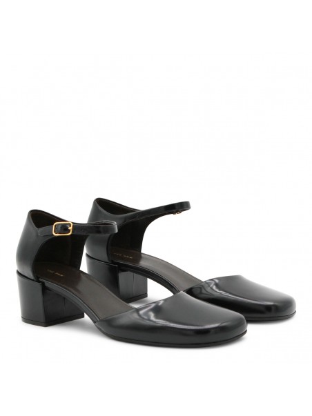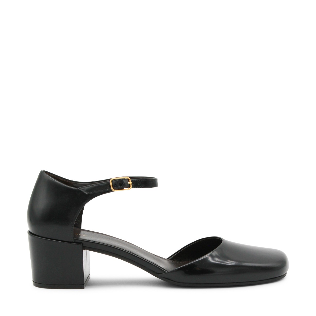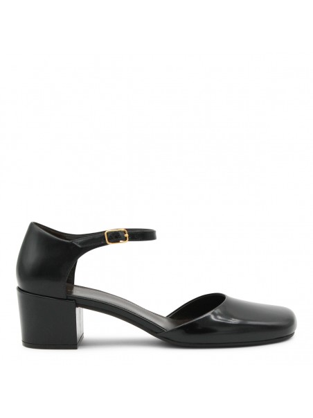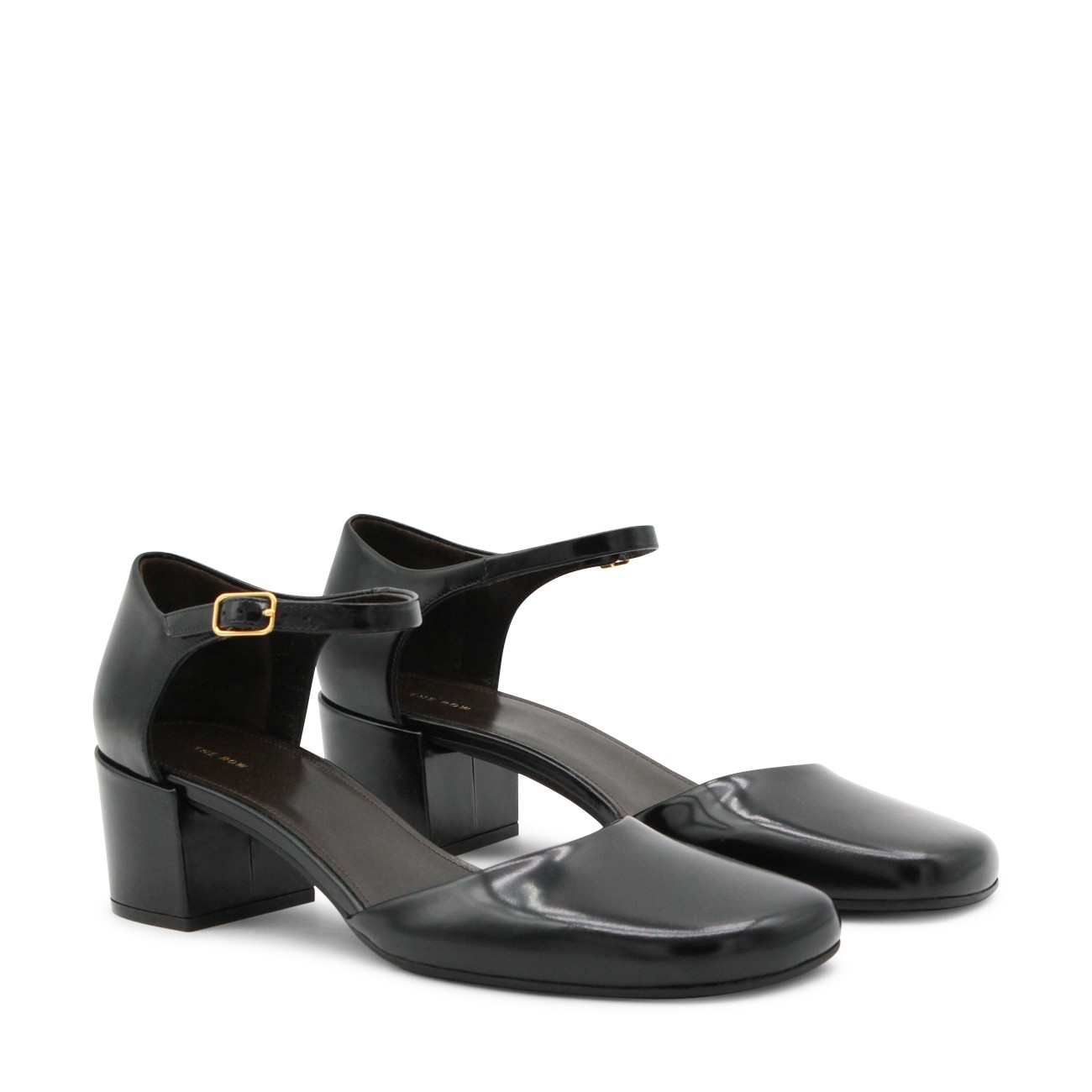 Black leather pumps from The Row featuring square toe, adjustable ankle strap and square heel.