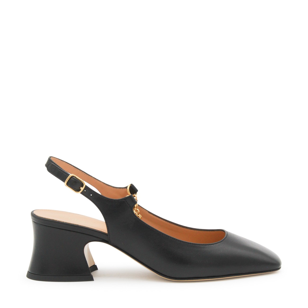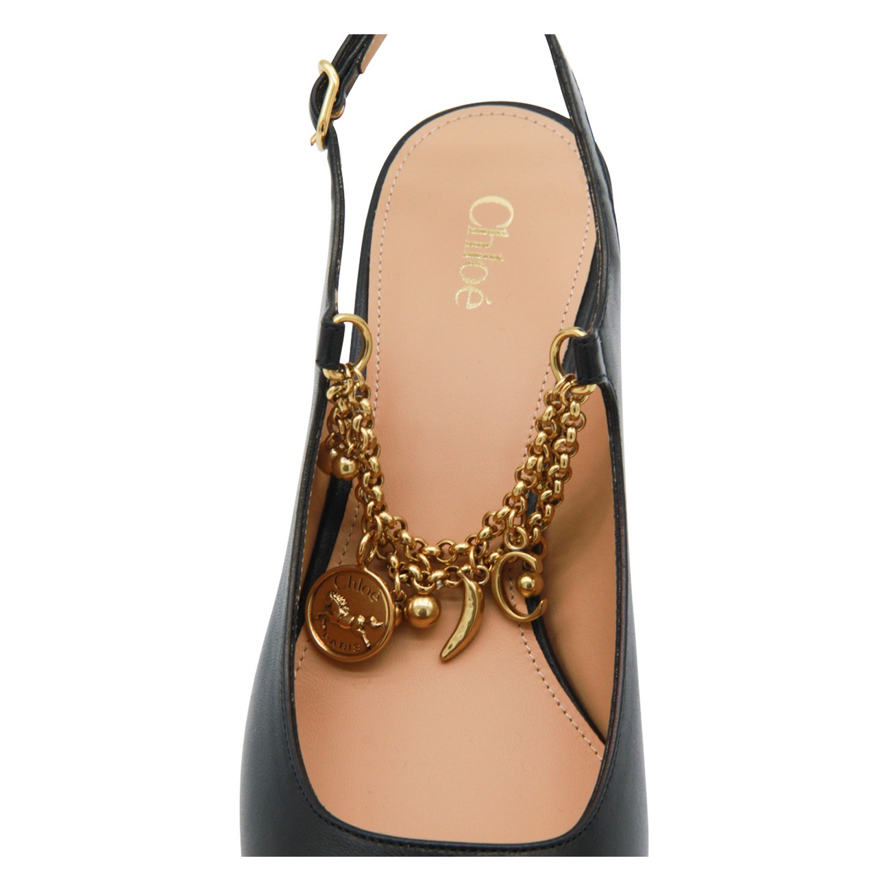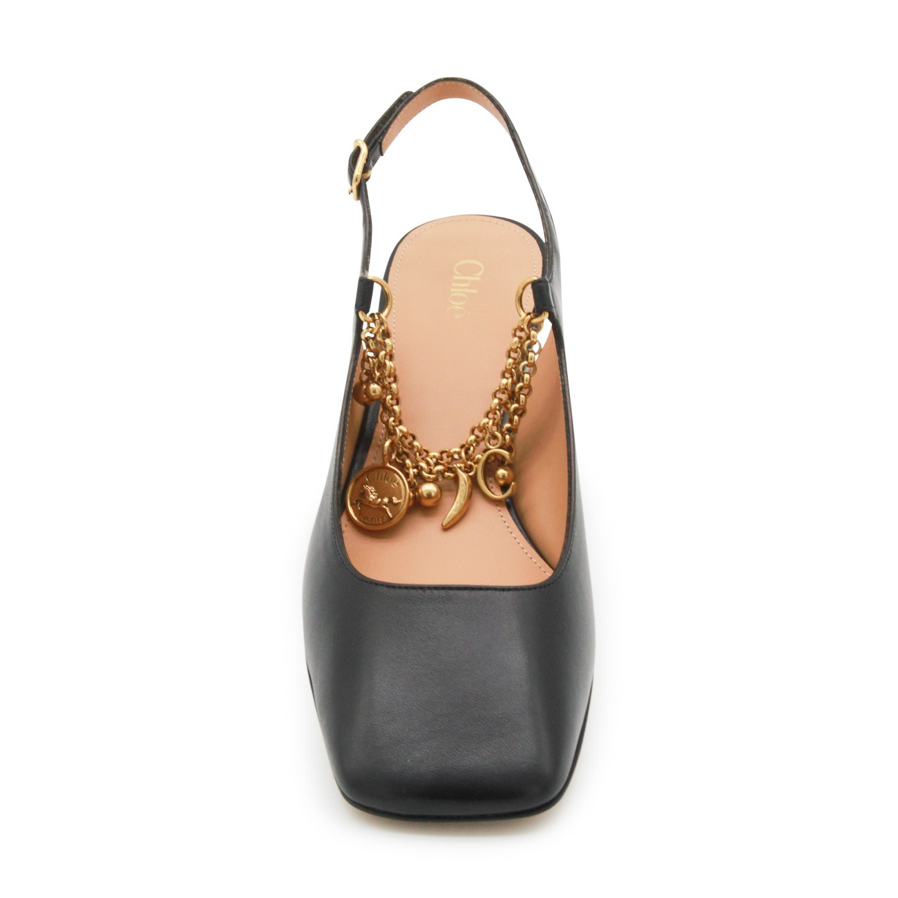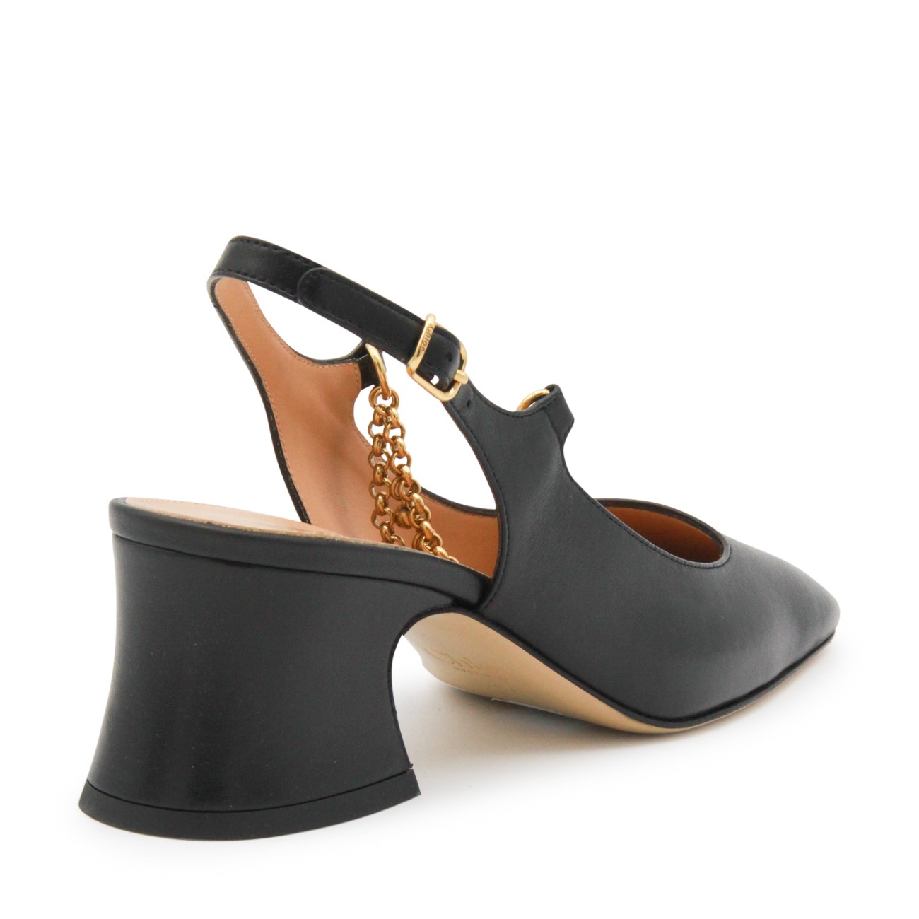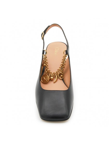 Black leather pumps from Chloè featuring pointed toe, square heel, lateral buckle fastening and open back.