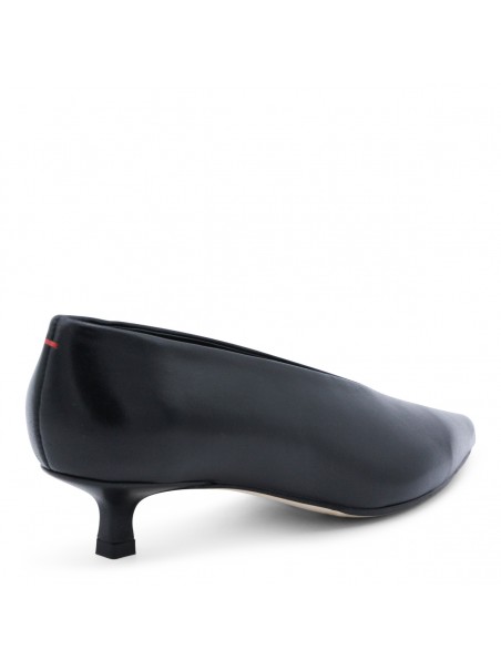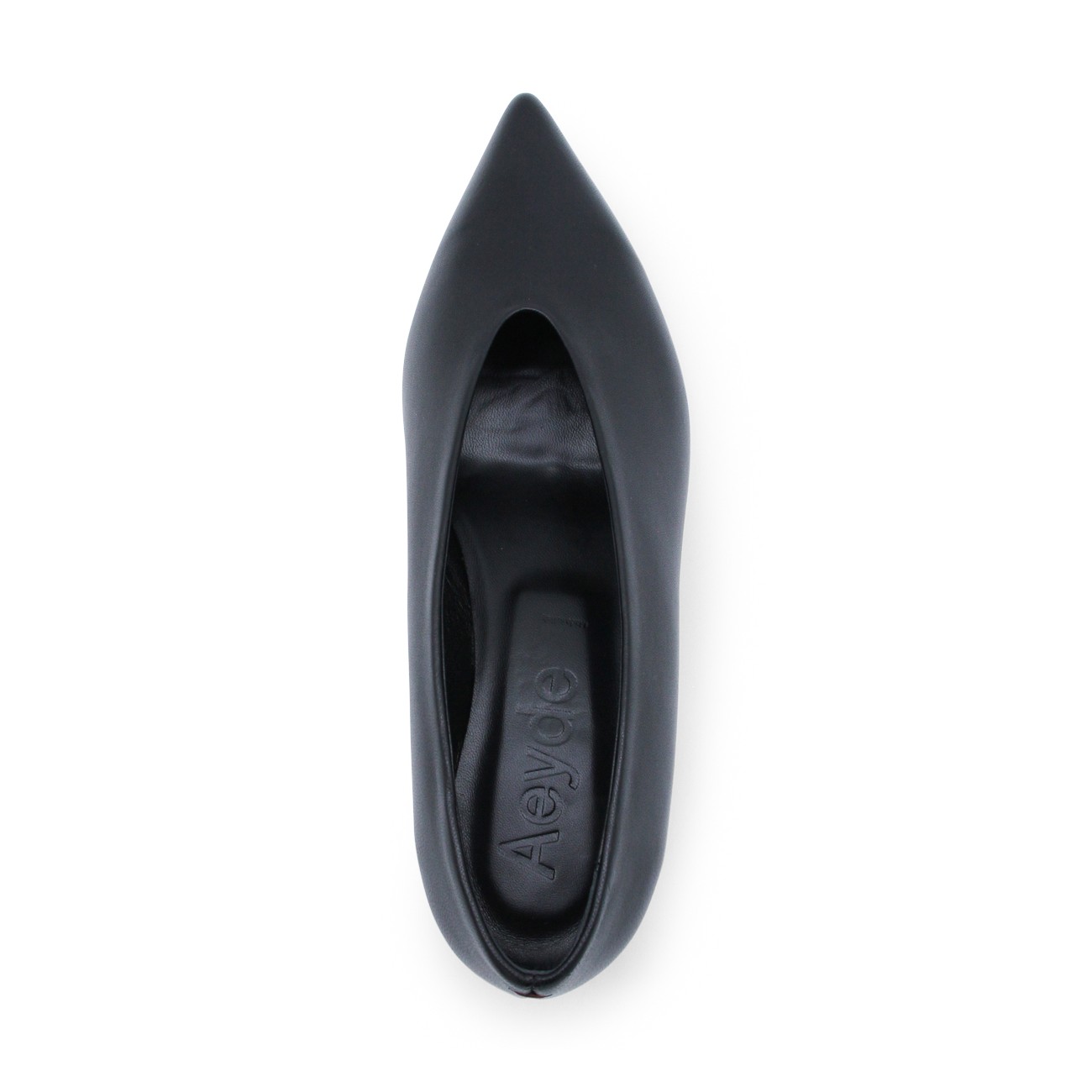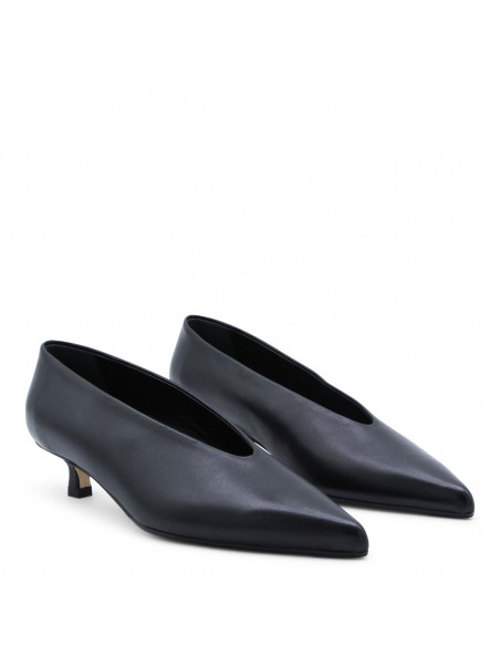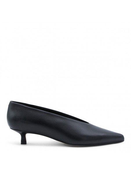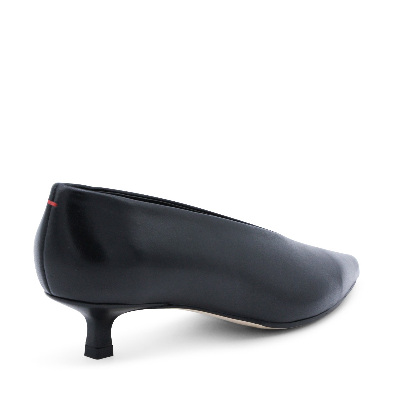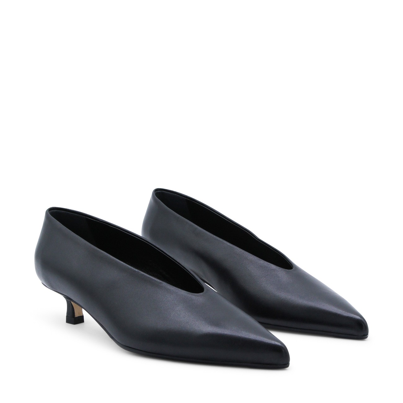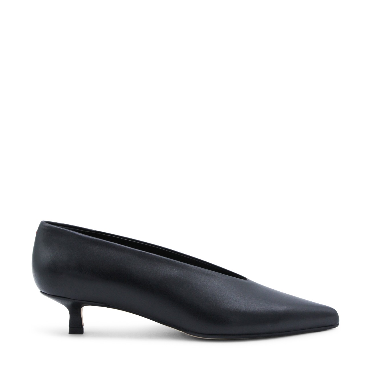 Black leather Clara pumps from Aeyde featuring pointed toe, slip-on style and kitten heel.