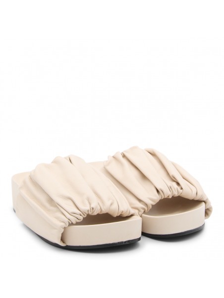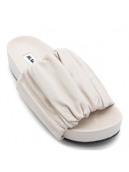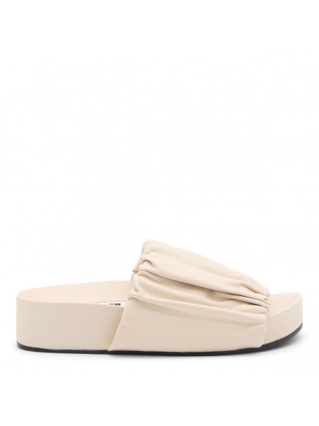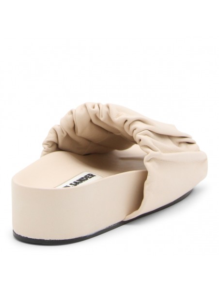 Light beige leather sandals from Jil Sander featuring ruched detailing, branded leather insole, open toe, platform sole and slip-on style.