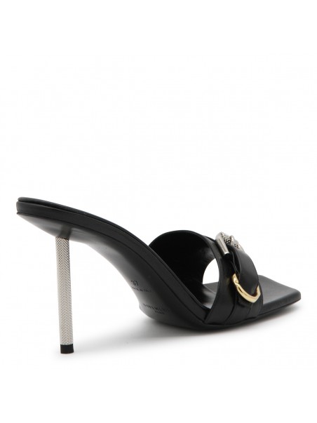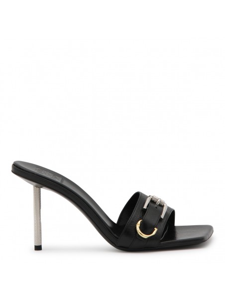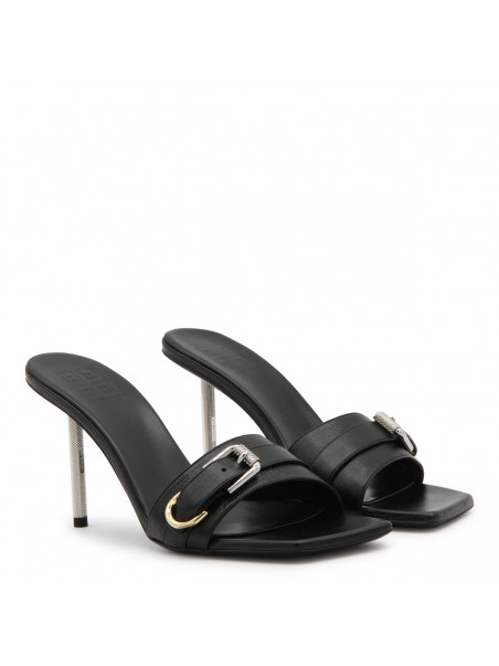 Black leather Voyou sandals from Givenchy featuring mules style, buckle strap accent at front, stiletto heel and square toe.