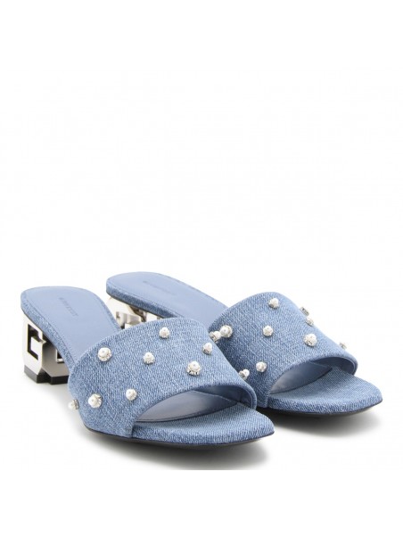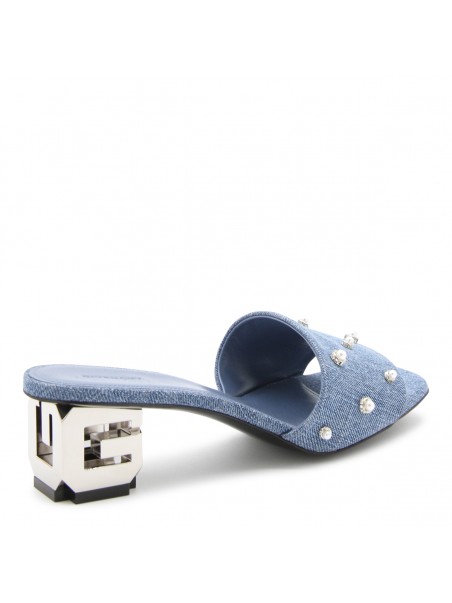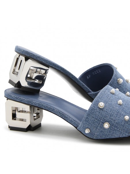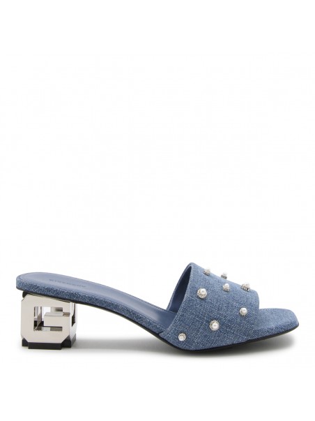 Medium blue denim G Cube mules from Givenchy featuring open toe, mid 4G Cube sculpture heel, branded insole and pearl embellishment at food band.