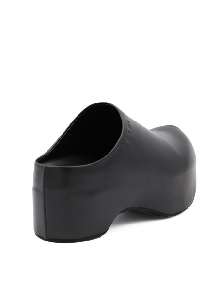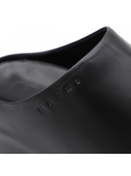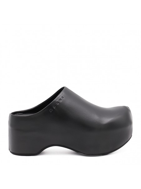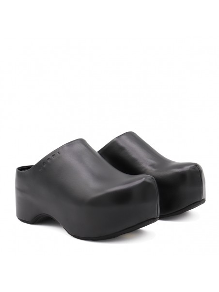 Black leather sandals from Marni featuring round toe, open back, slip-on style, plateau, engraved logo, rubber sole and branded insole.