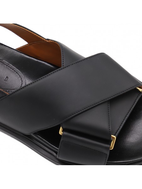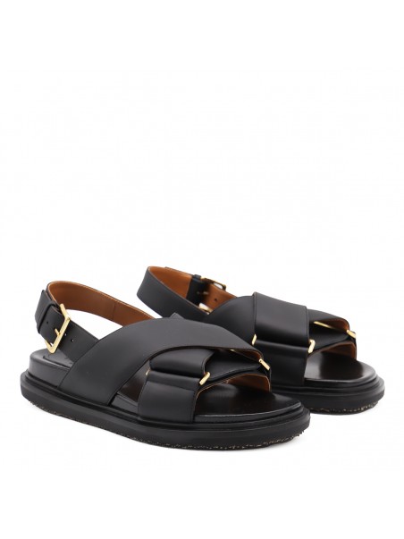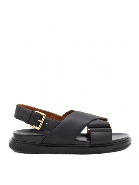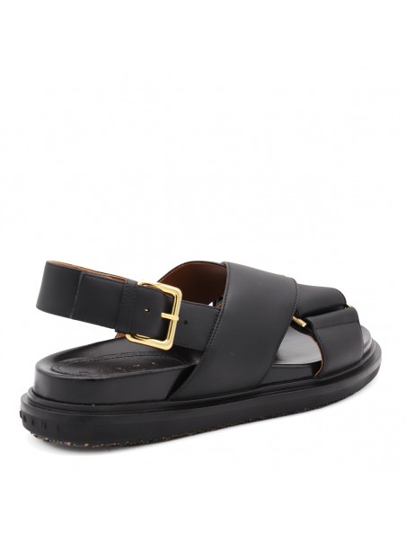 Black leather sandals from Marni featuring round open toe, back buckle fastening, leather sole and logo.