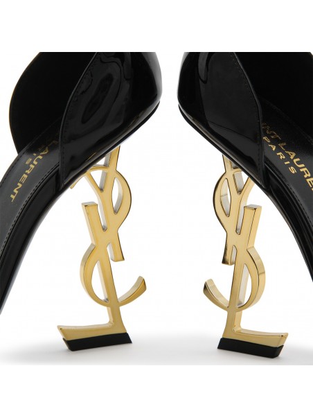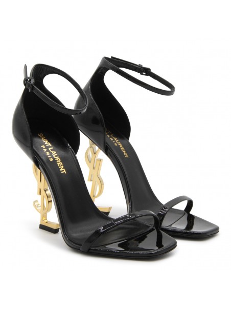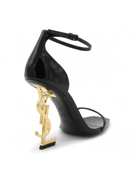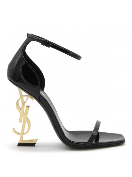Black vynil Opium sandals from Saint Laurent featuring squaree toe, adjustable ankle strap, open toe and sculpture heel with gold metal logo initials.