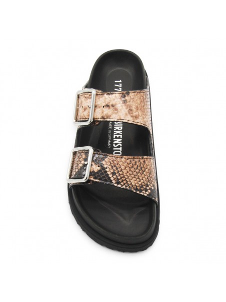 Brown and black leather Arizona Snake sandals from Birkenstock 1774 featuring round open toe, slip-on style, double buckles, snake texture and flat rubber sole.
