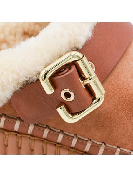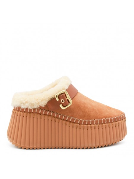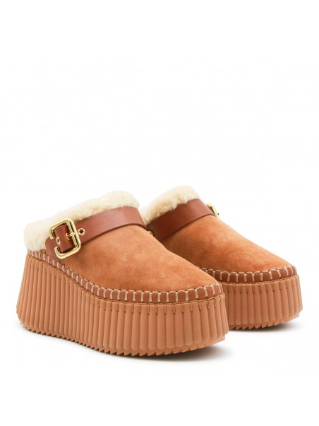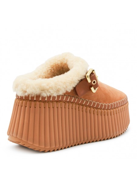 Brown leather sandals from Chlofeaturing round toe, inside hair, gold tone hardware, lateral buckle detail, oversize sole with wedge and leather sole.