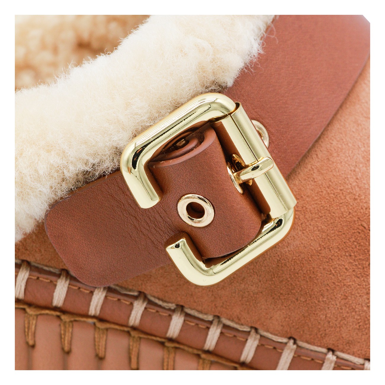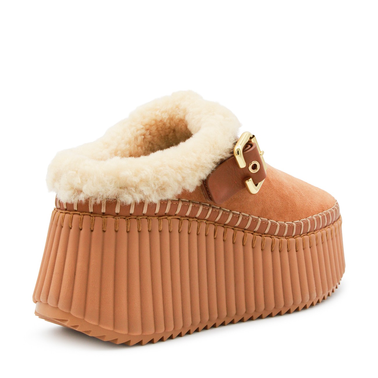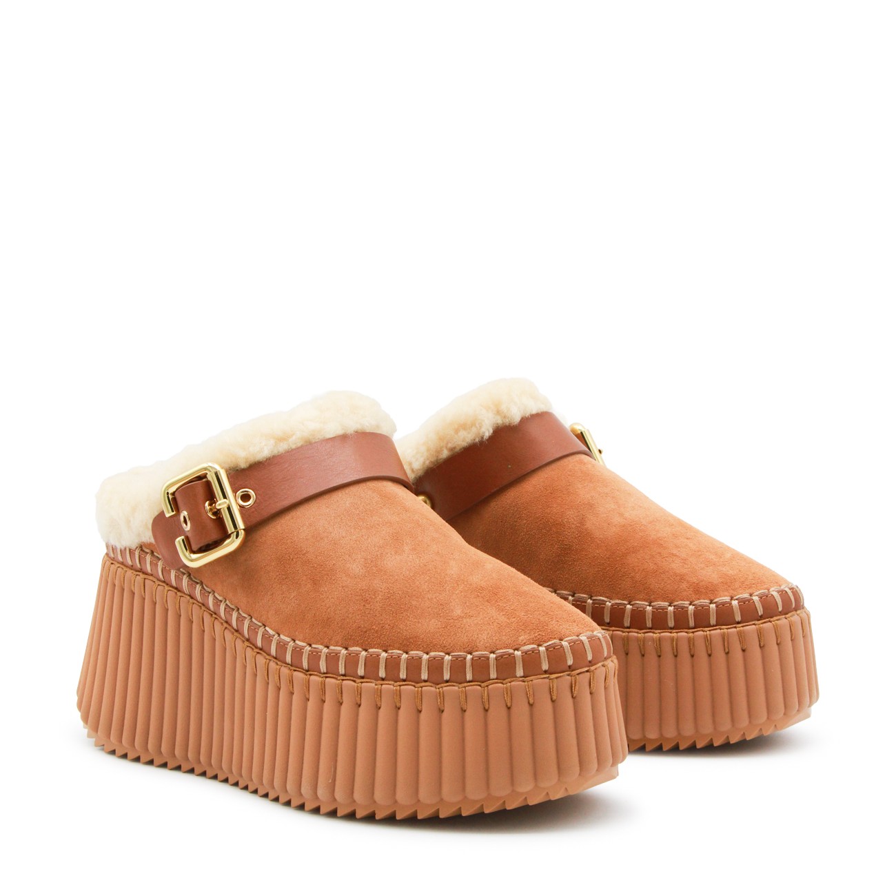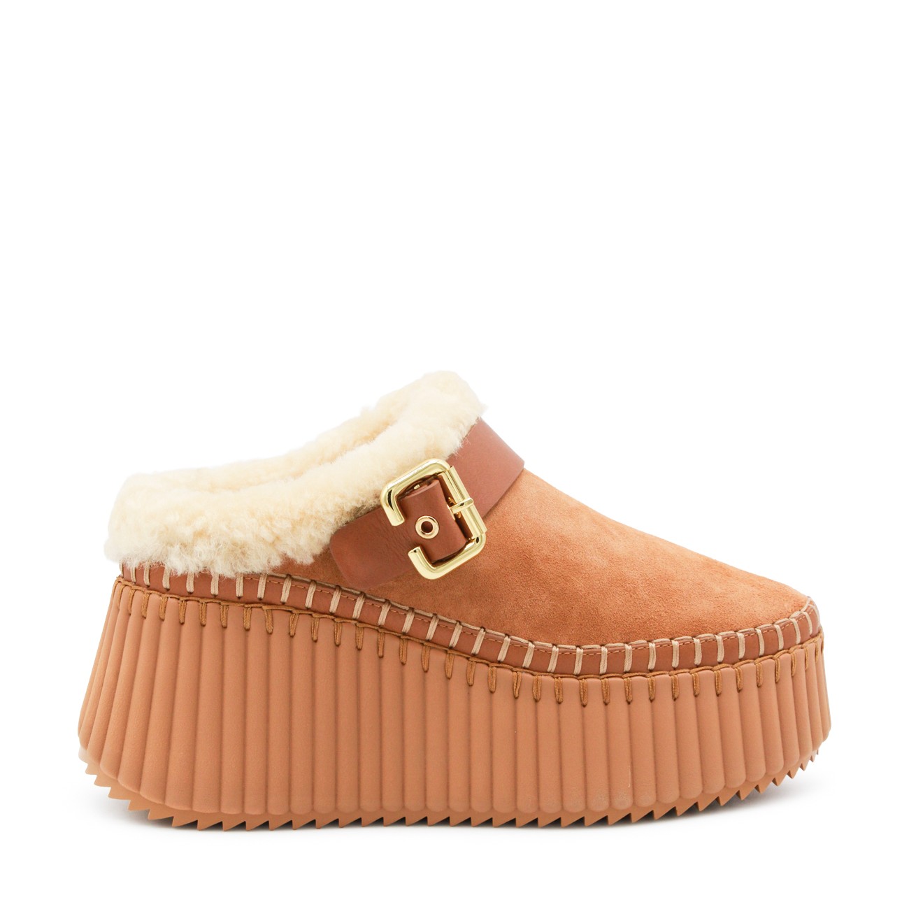 Brown leather sandals from Chlofeaturing round toe, inside hair, gold tone hardware, lateral buckle detail, oversize sole with wedge and leather sole.