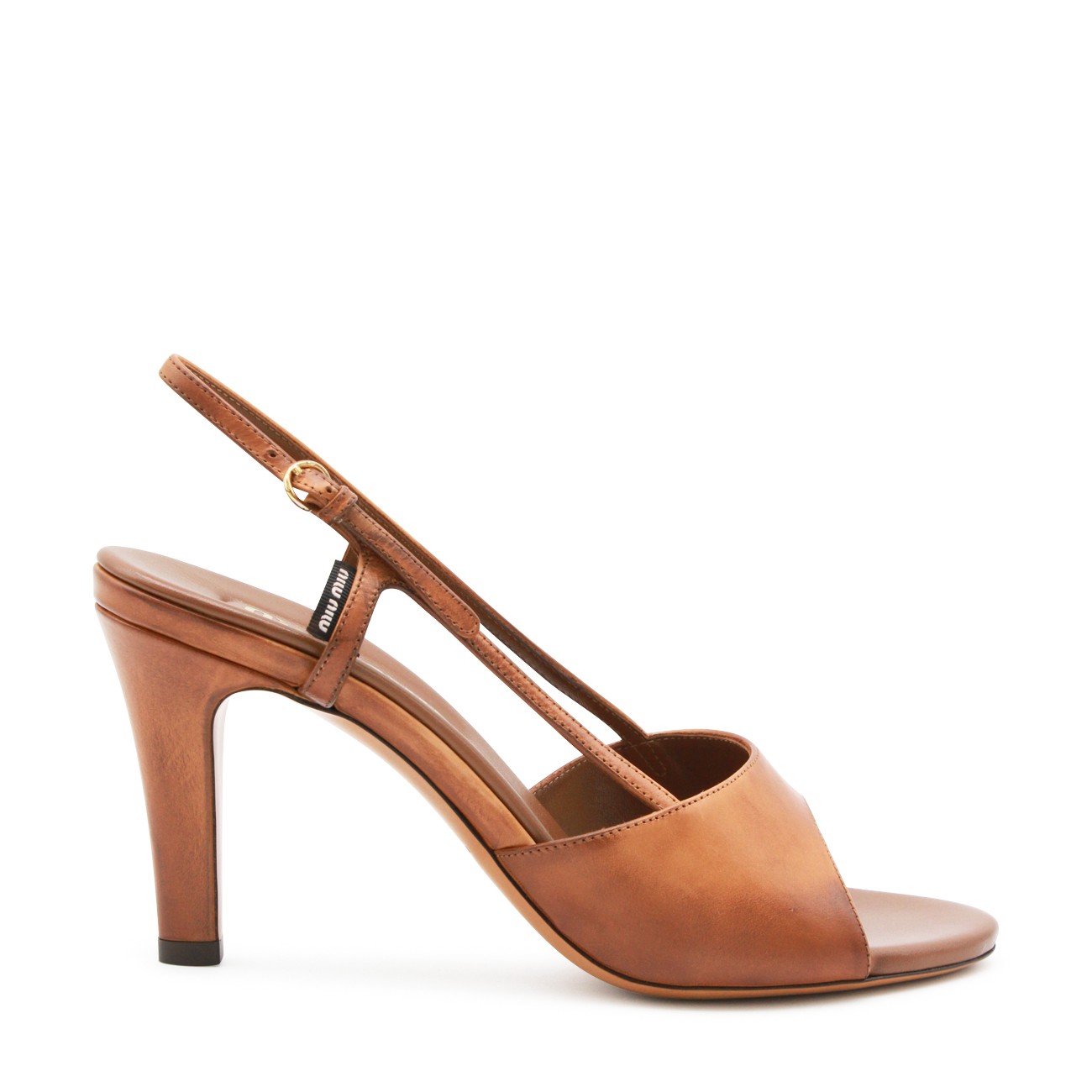 Brown leather sandals from Miu Miu featuring round open toe, adjustable ankle strap fastening, branded insole and stiletto heel.