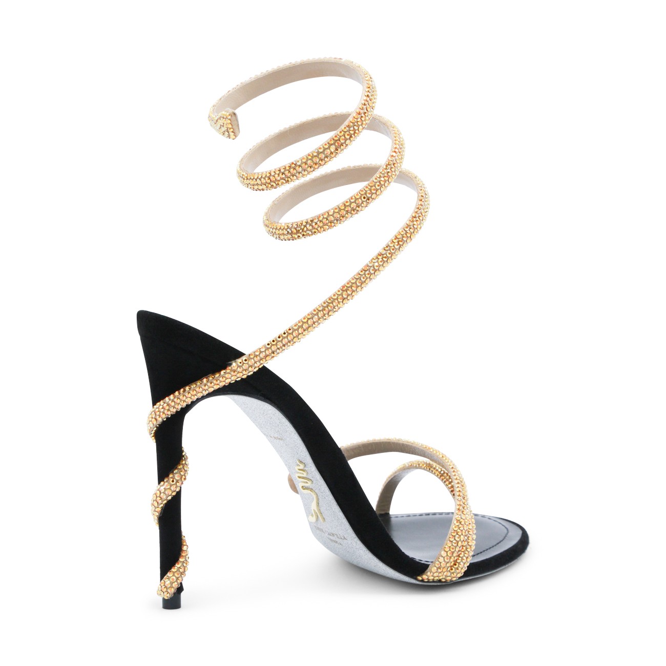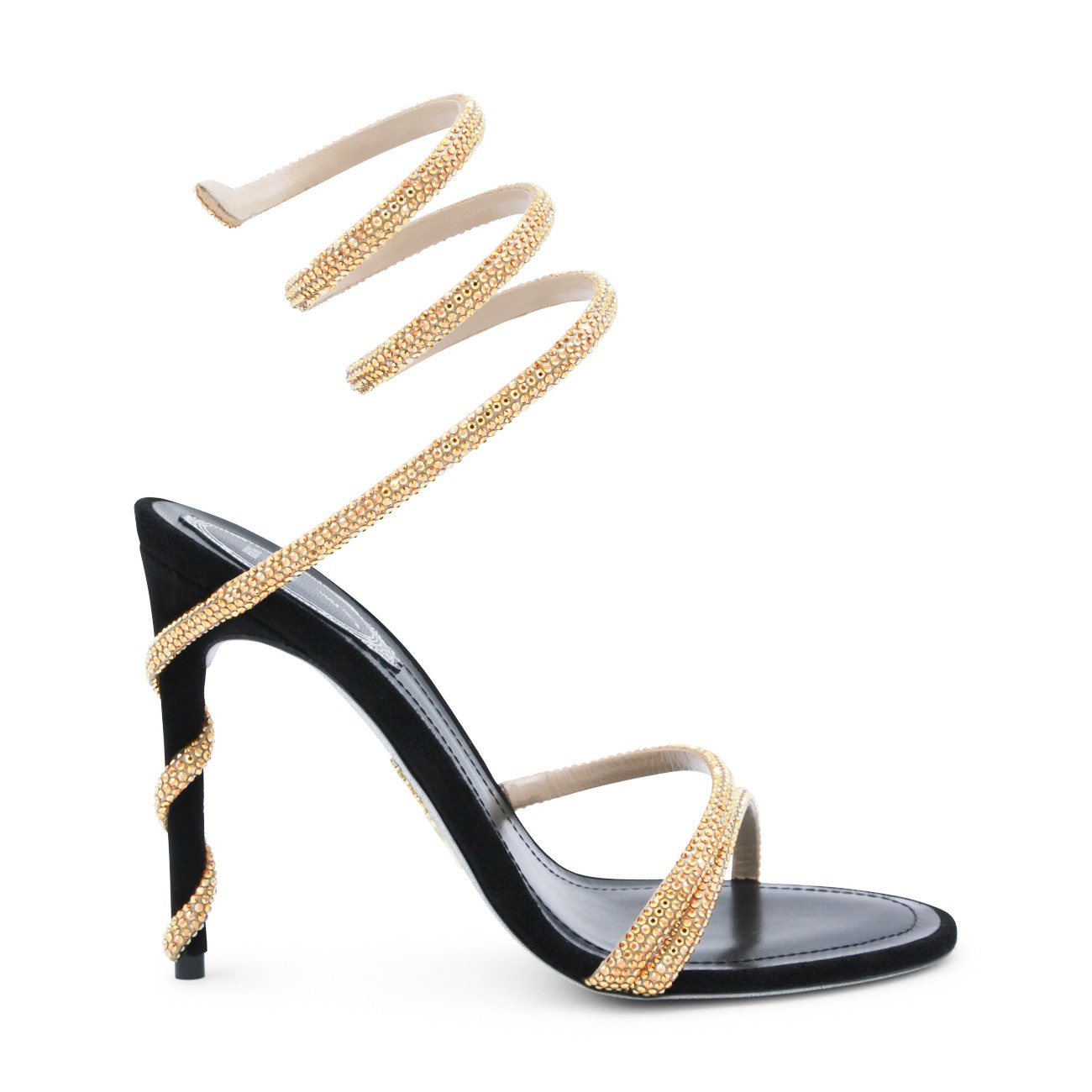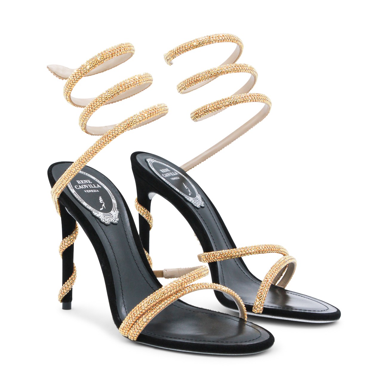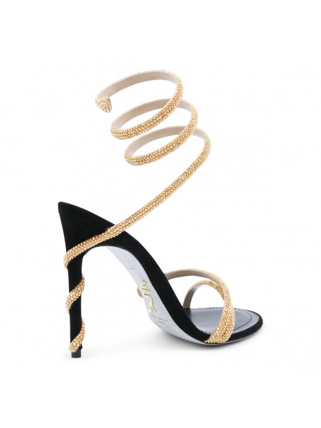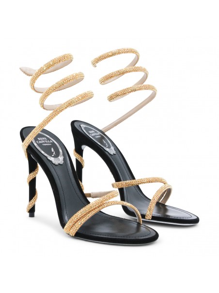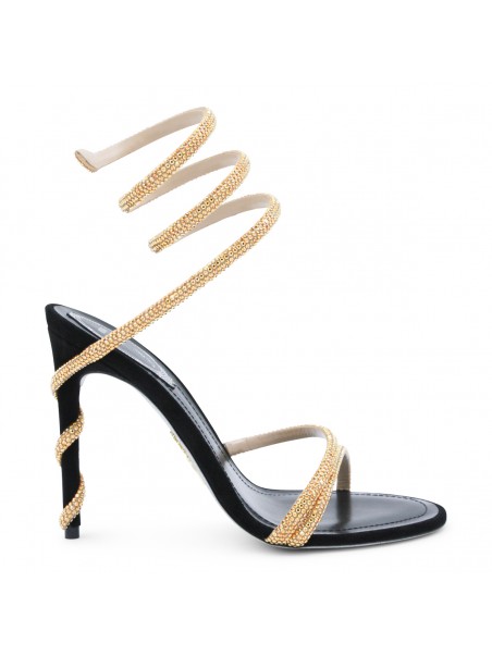 Black and gold leather sandals from Rene Caovilla featuring round toe, open back and lateral, stiletto heel, ankle golden detail and strass.
