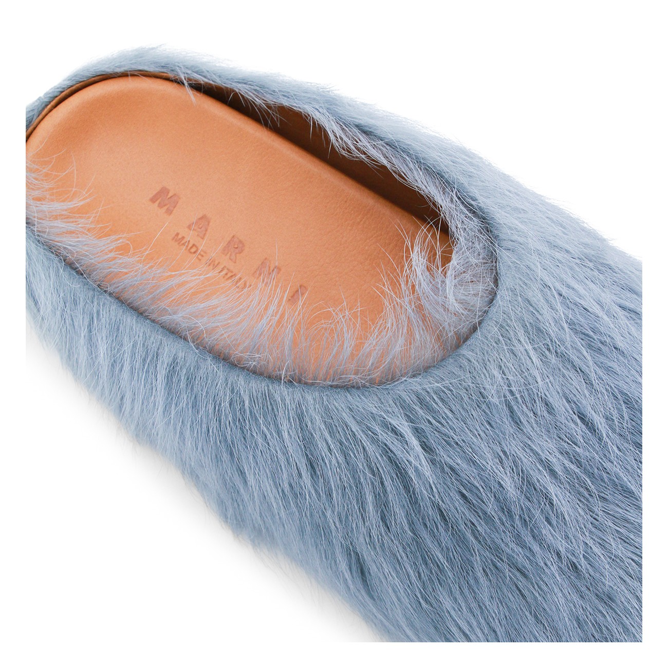 Light blue leather sandals from Marni featuring round toe, open back, slip-on style, calf hair upper and rubber sole.