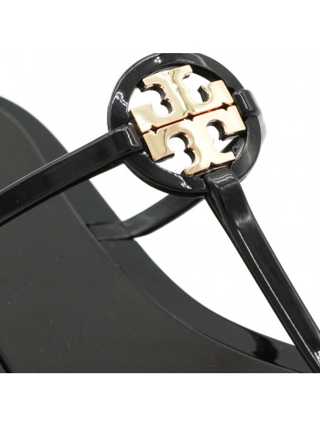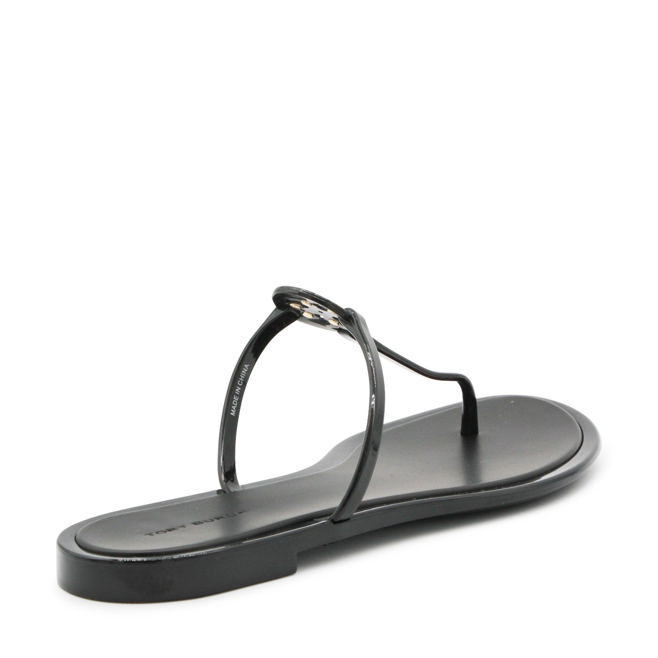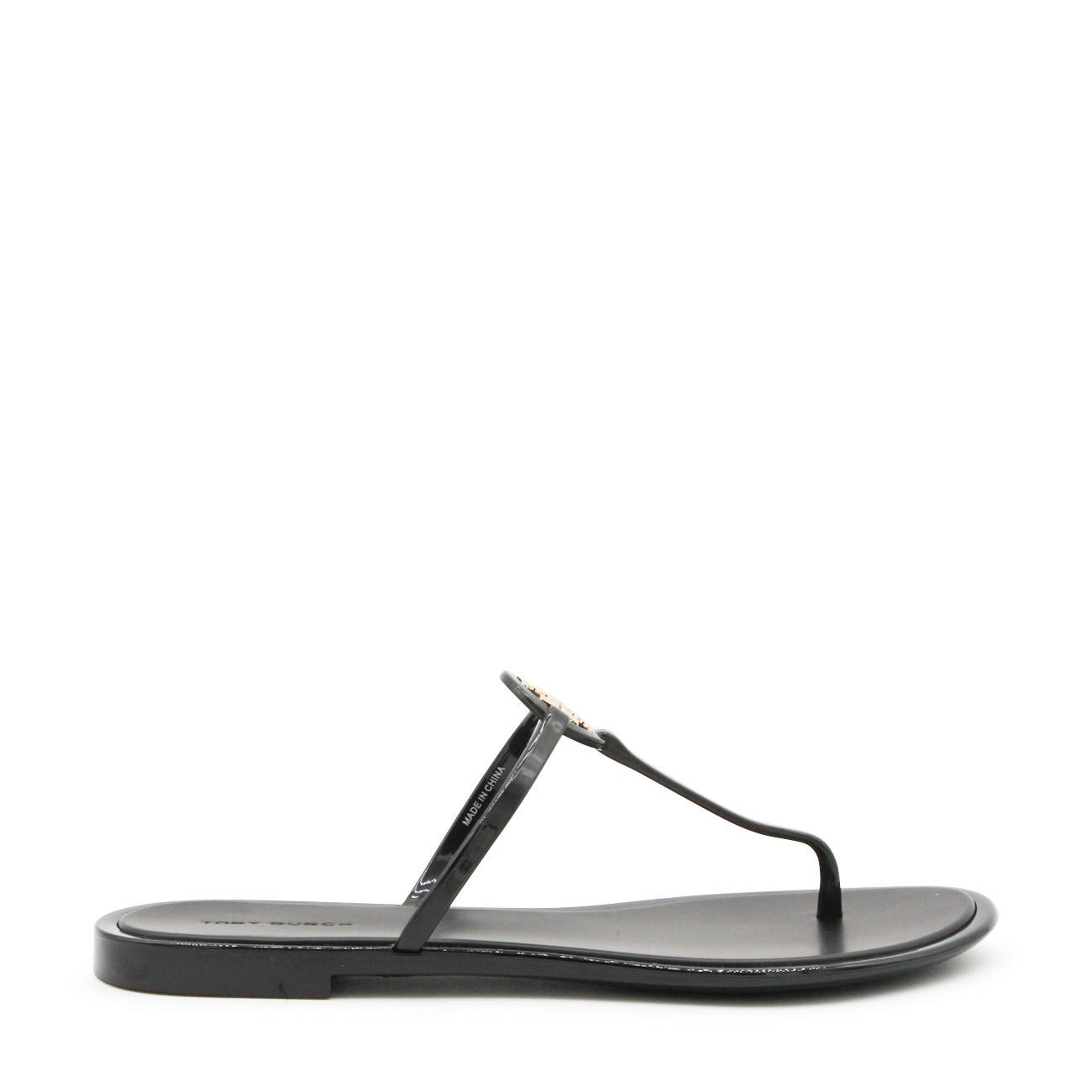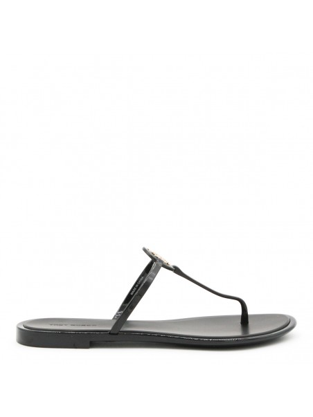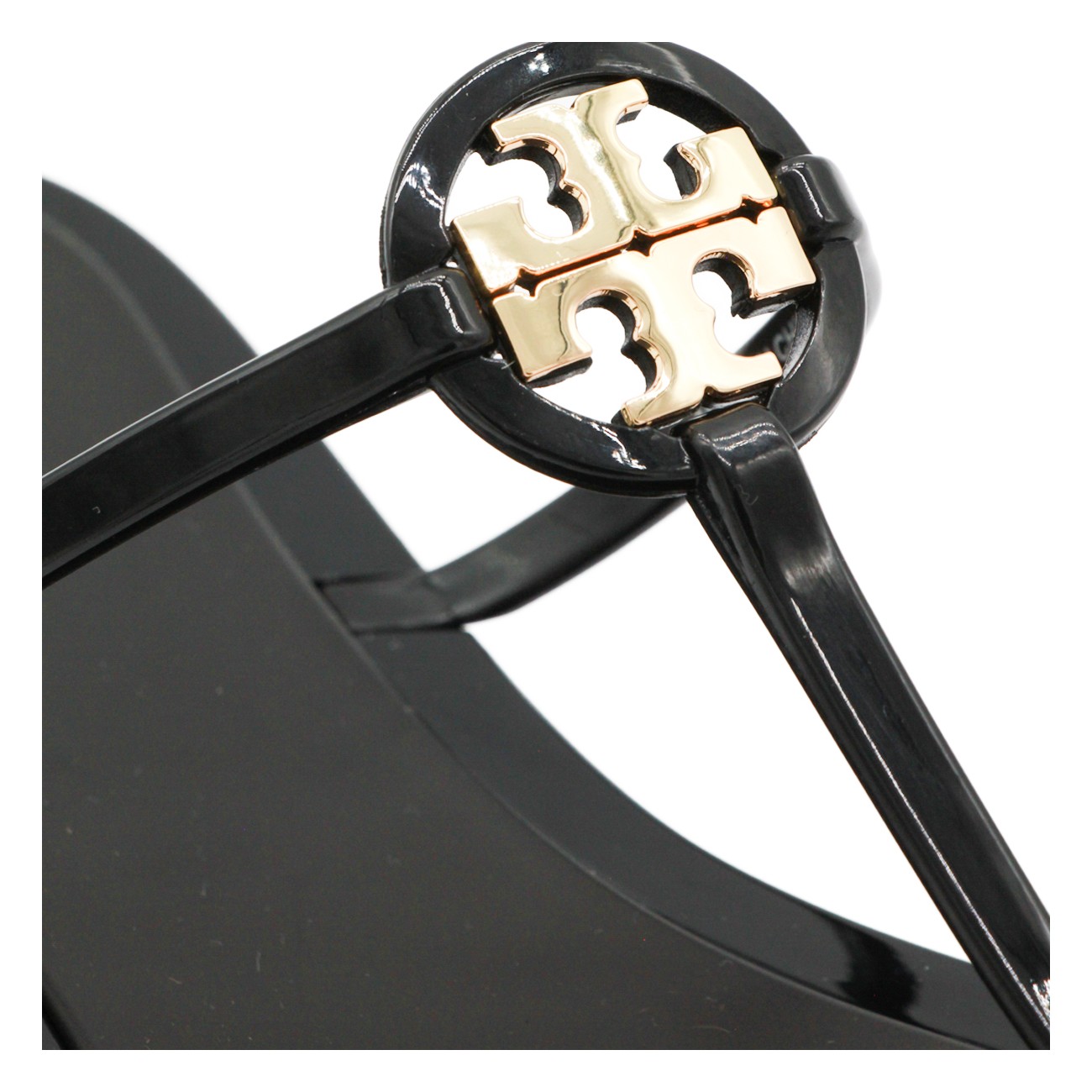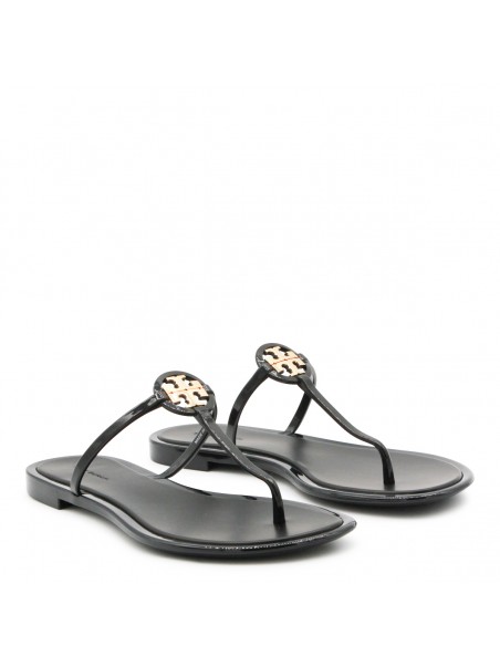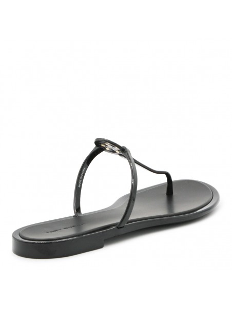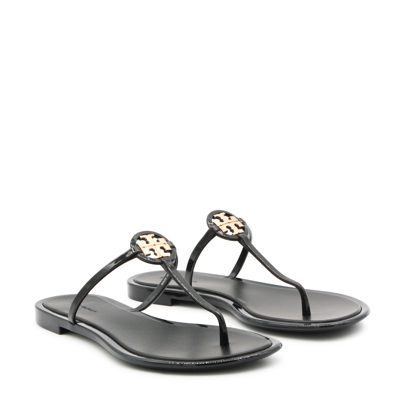 Black sandals from Tory Burch featuring round toe, gold tone logo and open back.