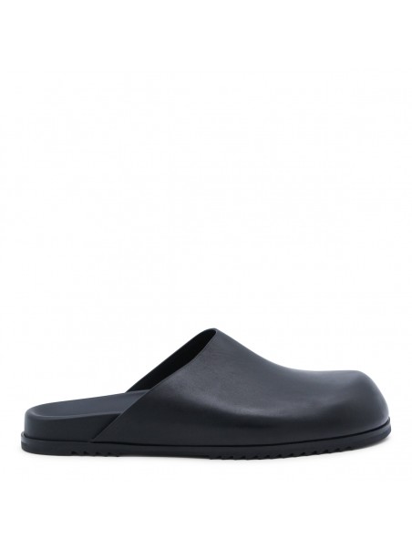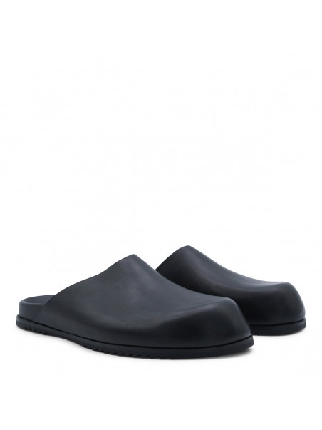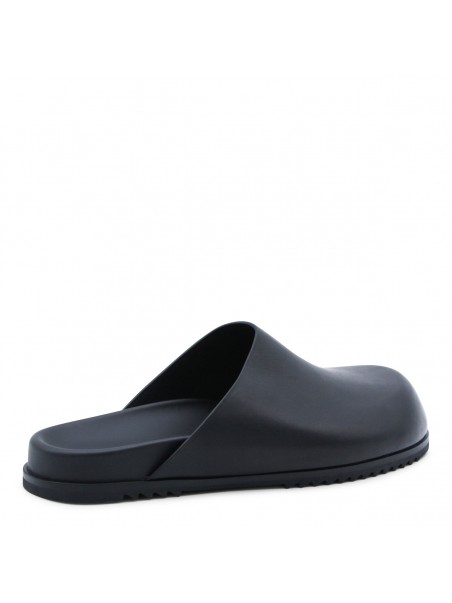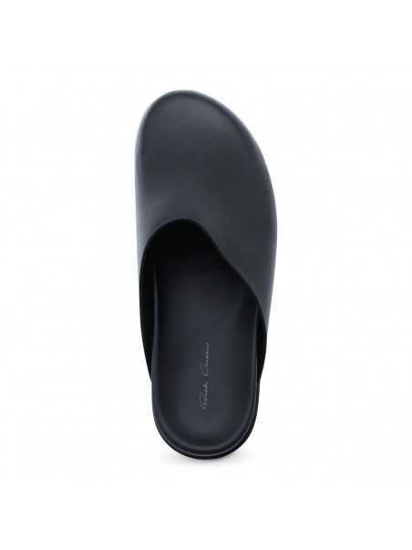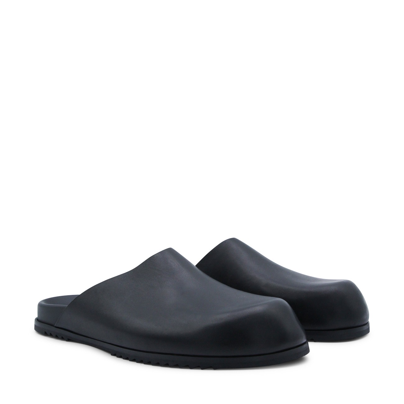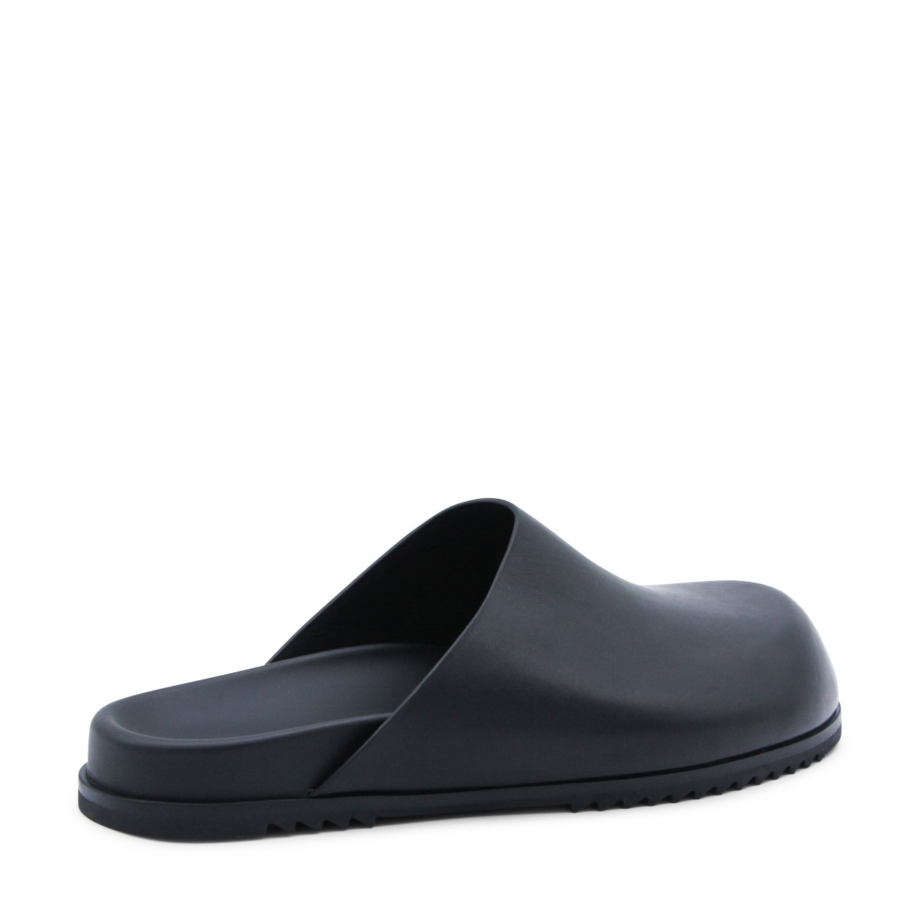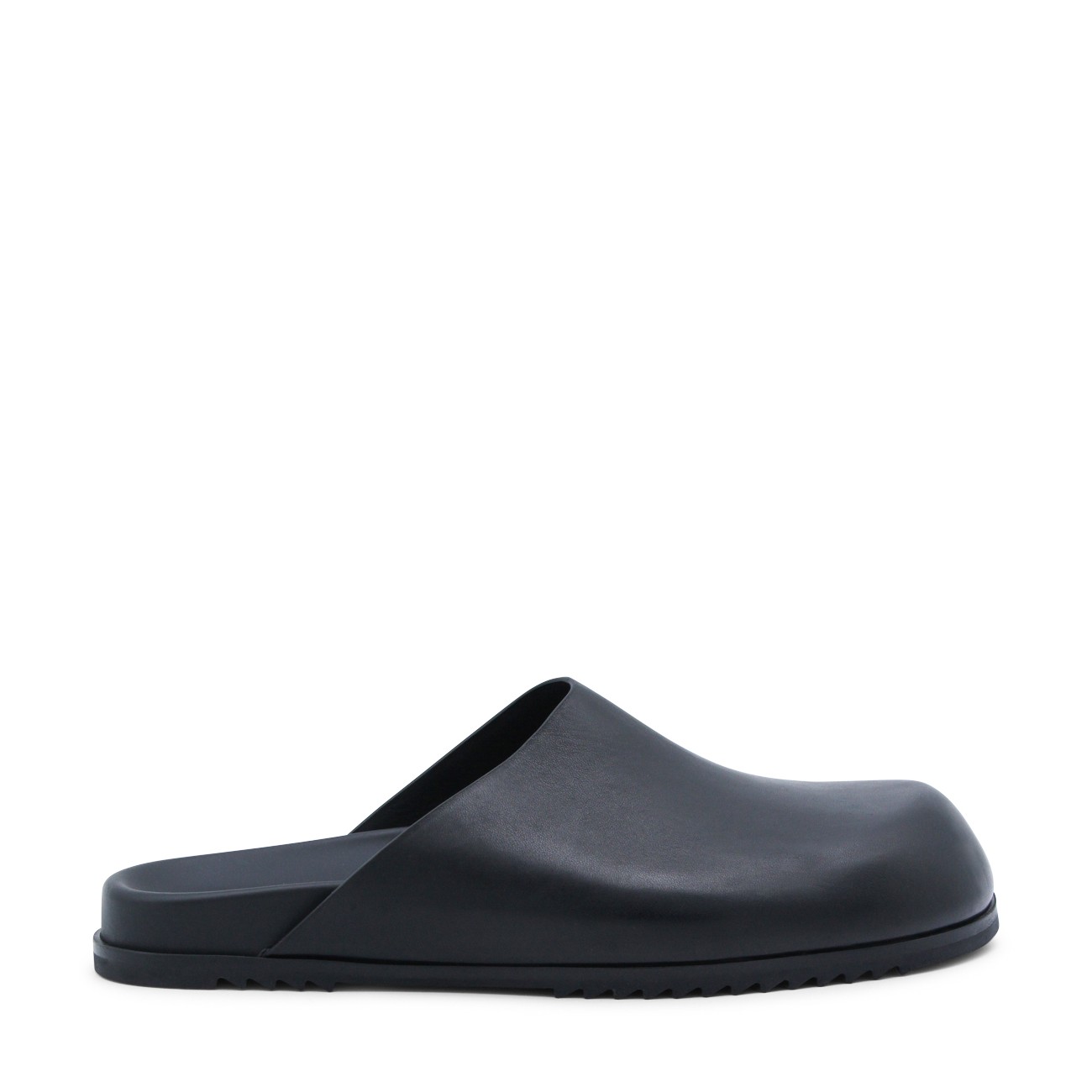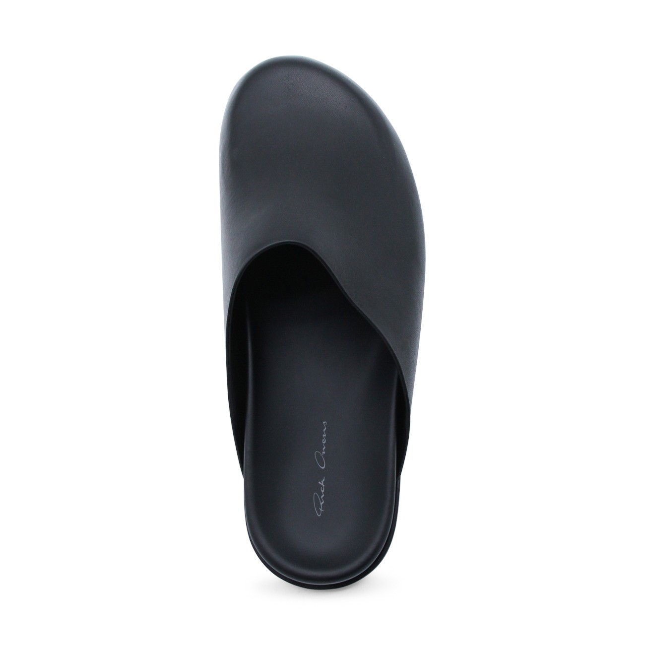 Black leather sandals from Rick Owens featuring round toe, open back, slip-on style, leather sole and branded insole.