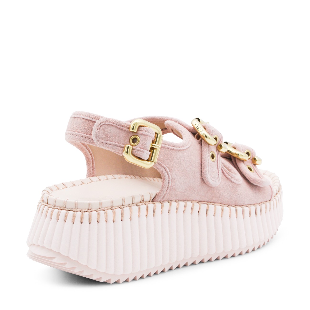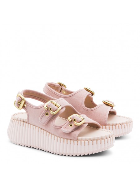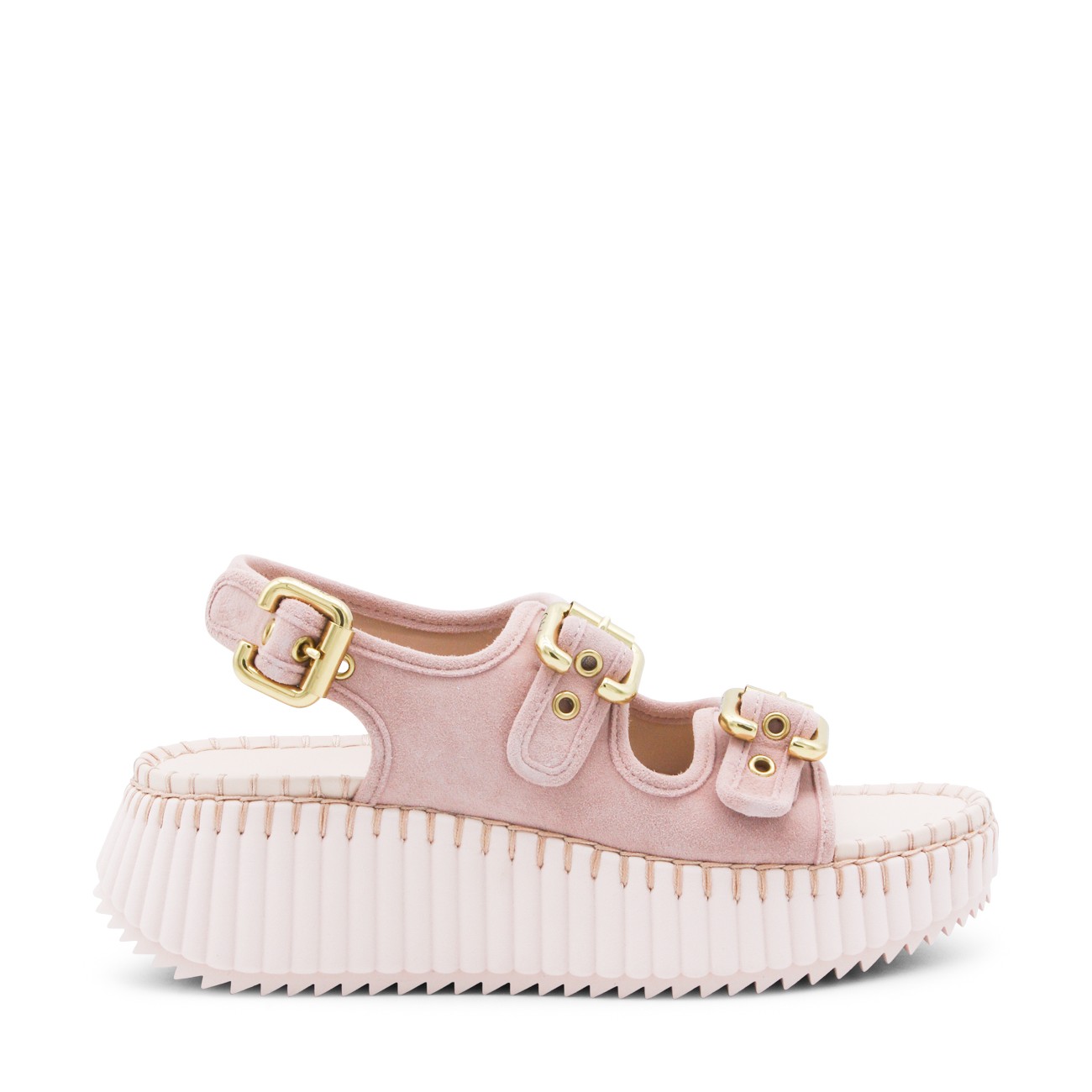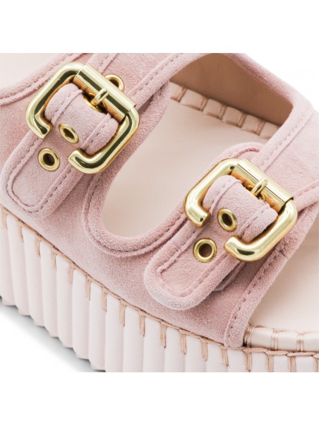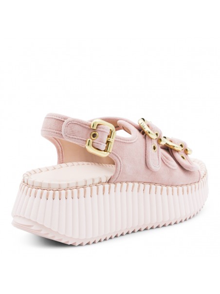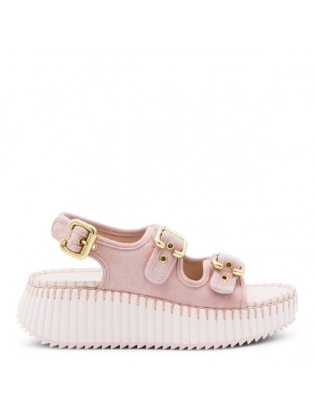 Pink leather Nama sandals from Chloé featuring round open toe, double front straps, adjustable ankle strap, gold tone Paddington buckles, tonal blanket stitch and platform heel.