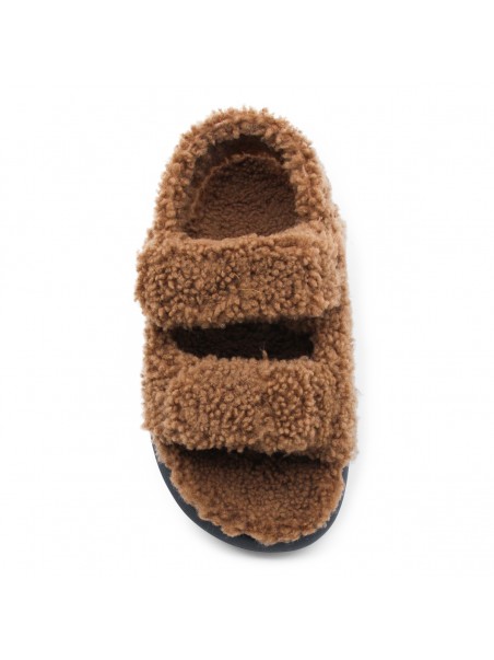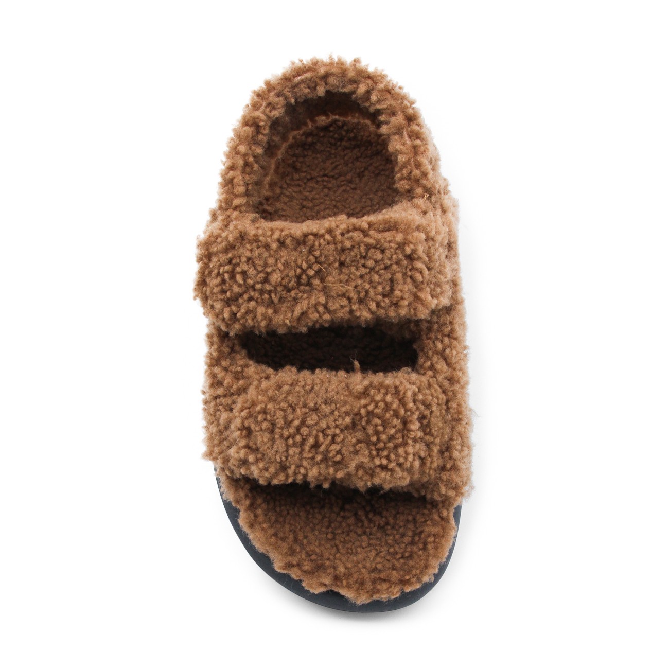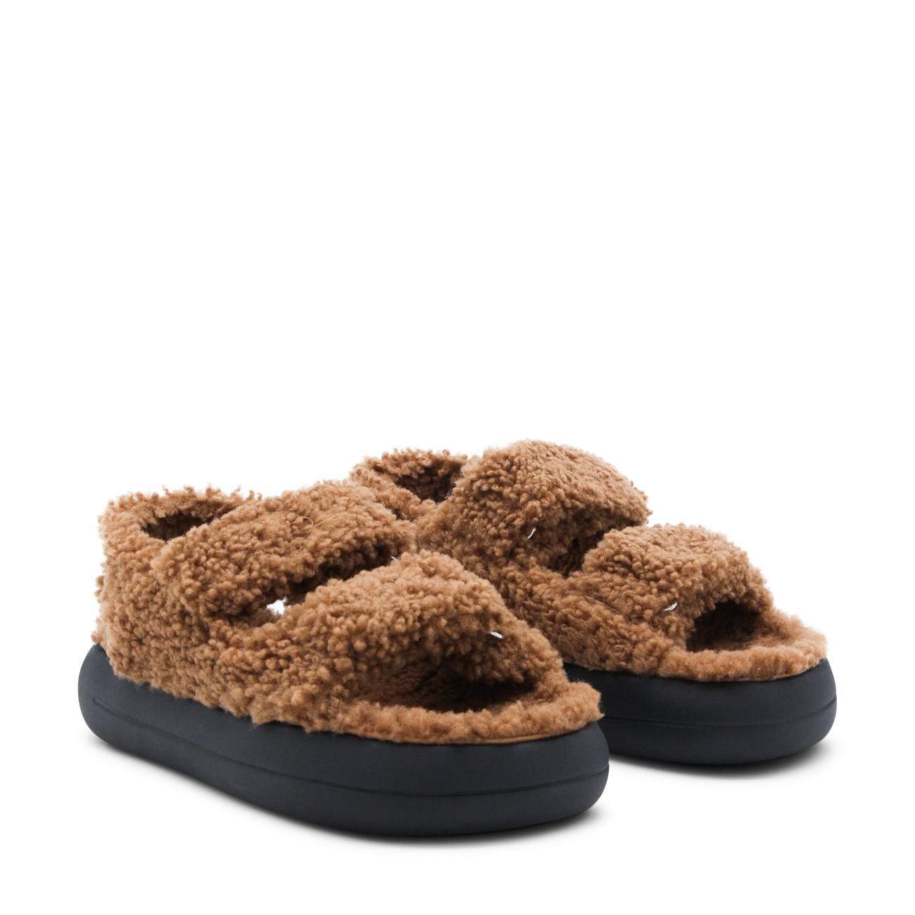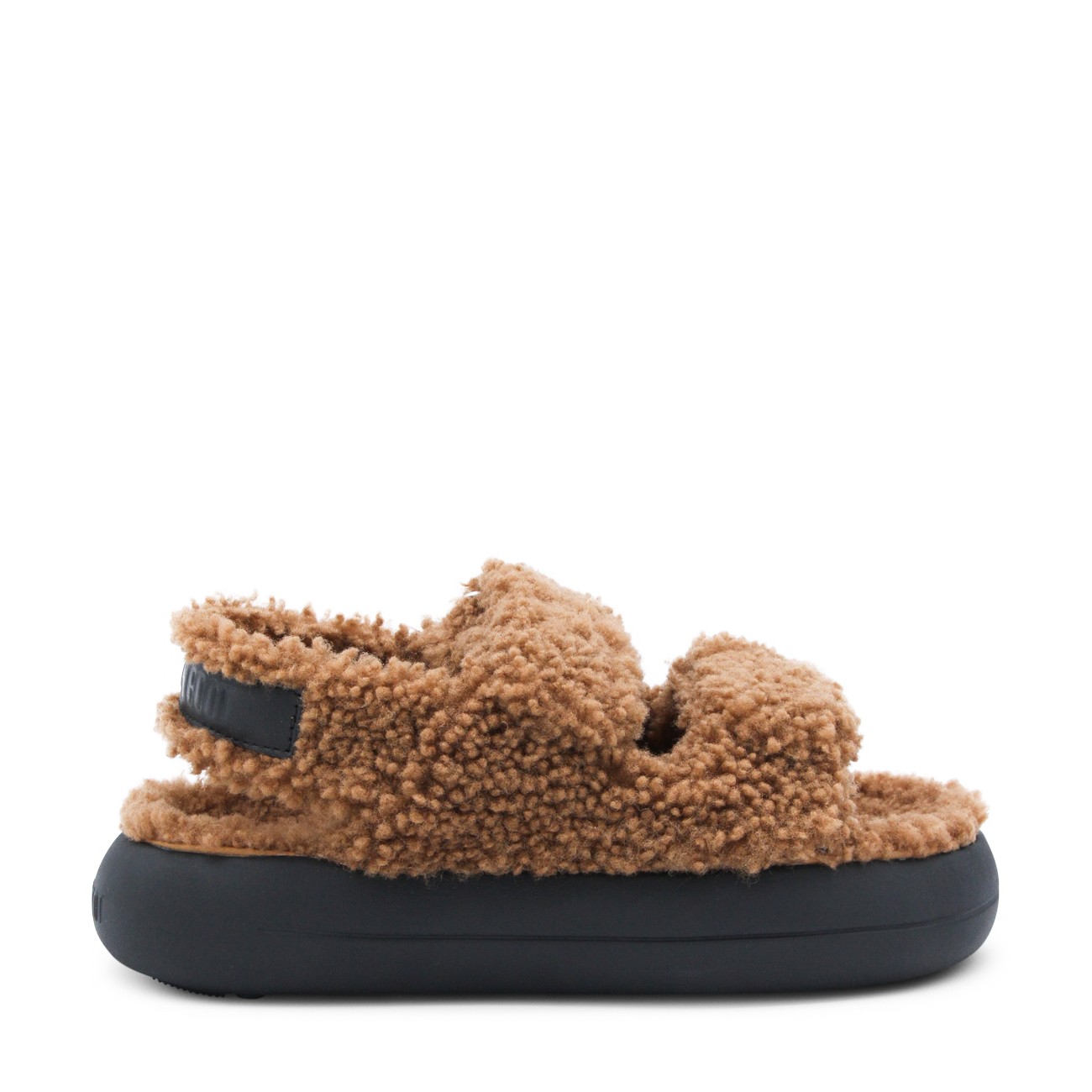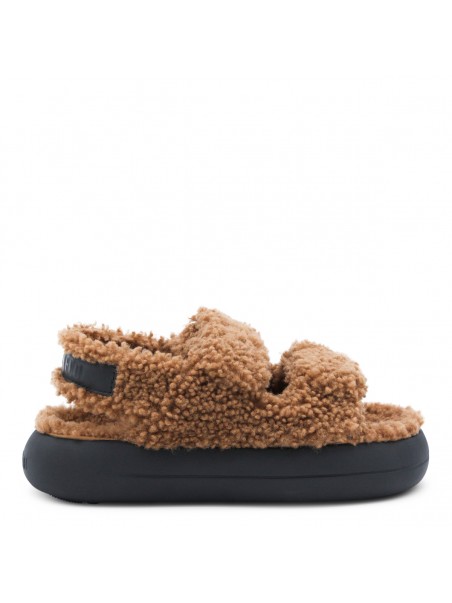 Cognac leather sandals from Moon Boot featuring round open toe, adjustable straps, super-cushioned rubber sole and shearling fur.