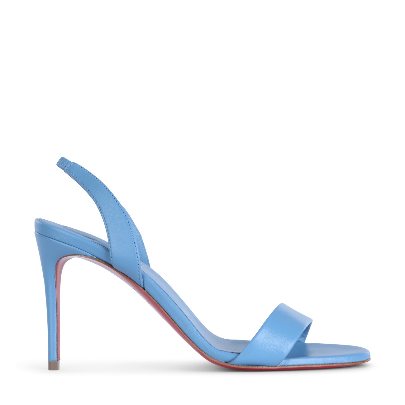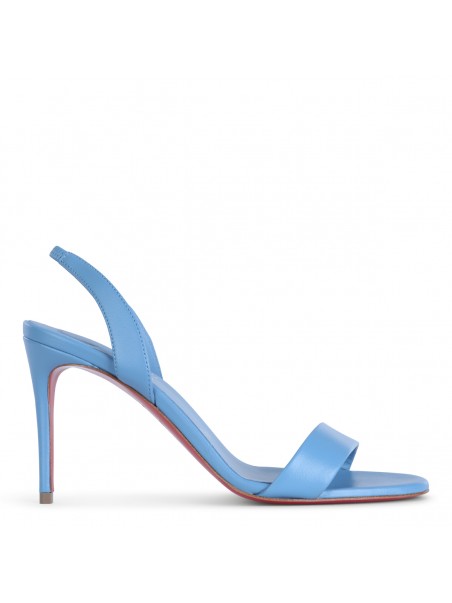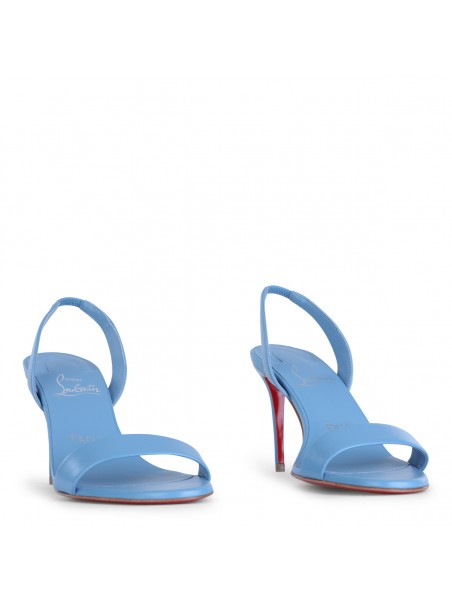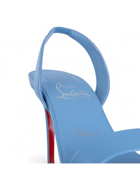 Light blue leather Marylin sandals from Christian Louboutin featuring open toe, branded contrasted insole, high covered heel and thin straps at front.