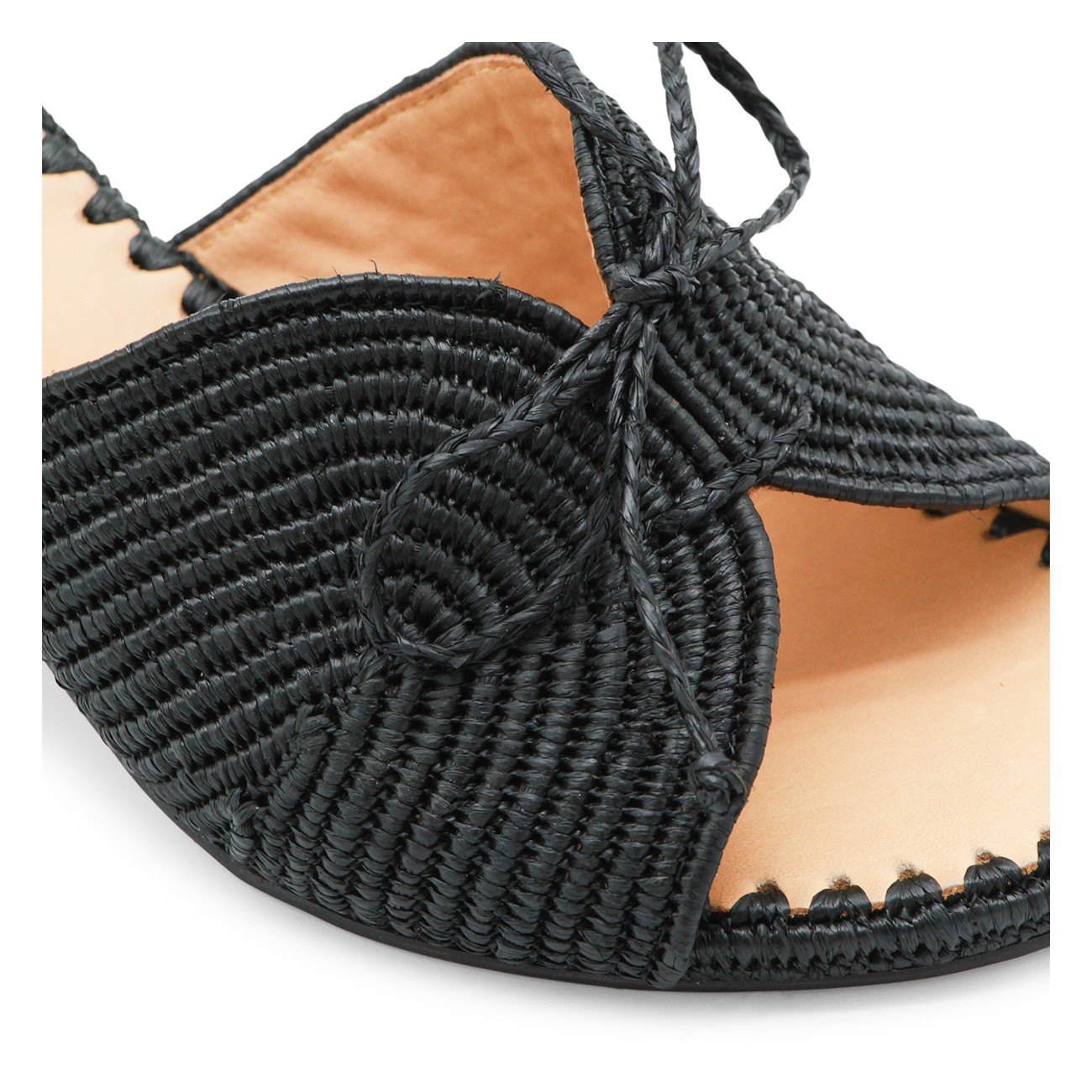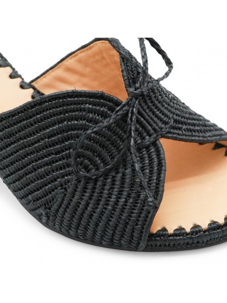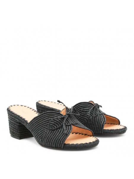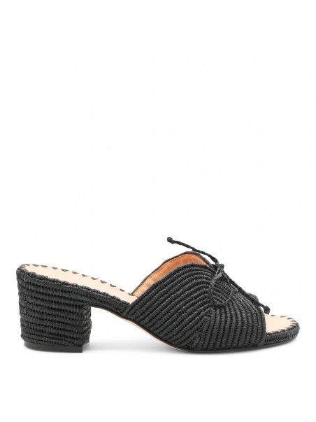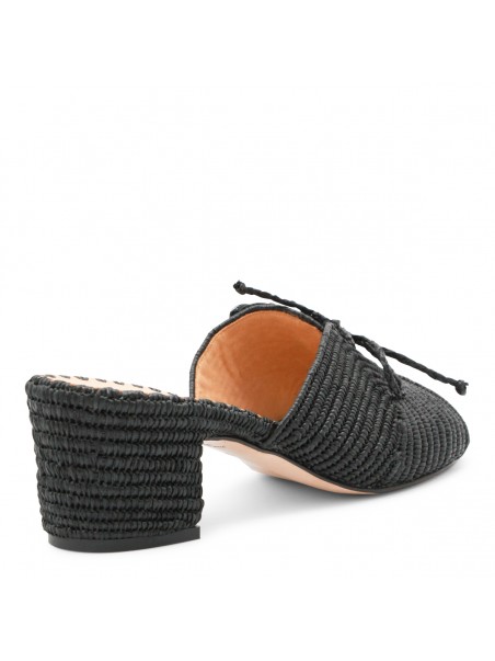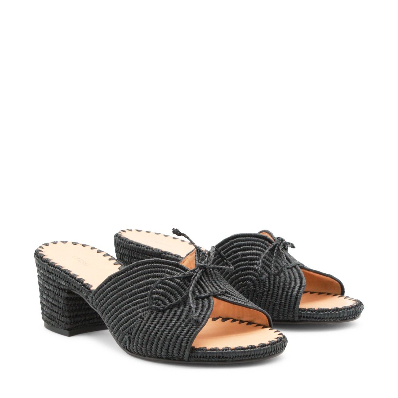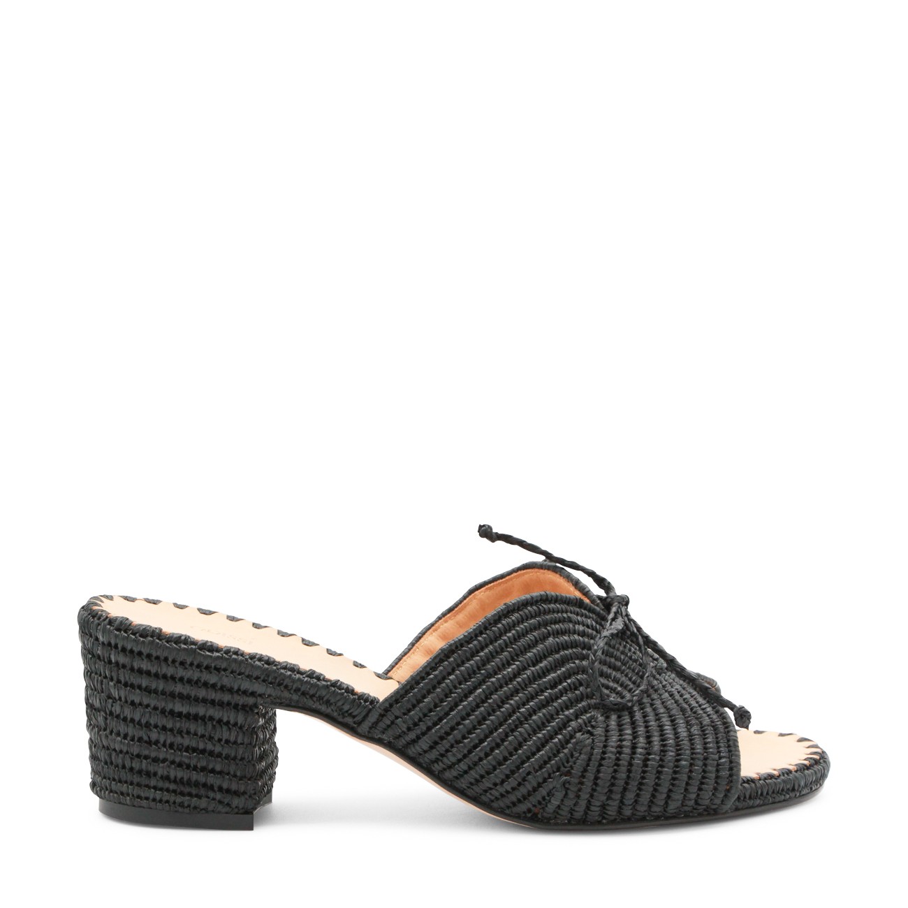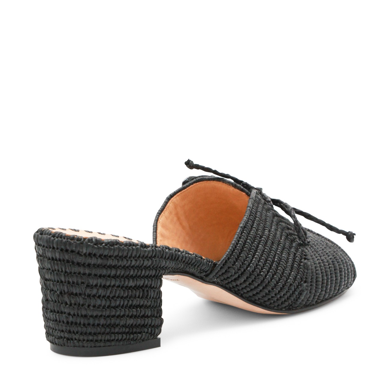 Black Odett sandals from Odissi featuring open toe, mid covered block heel, branded insole, elbow details and raffia texture.