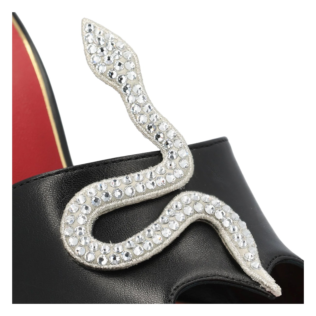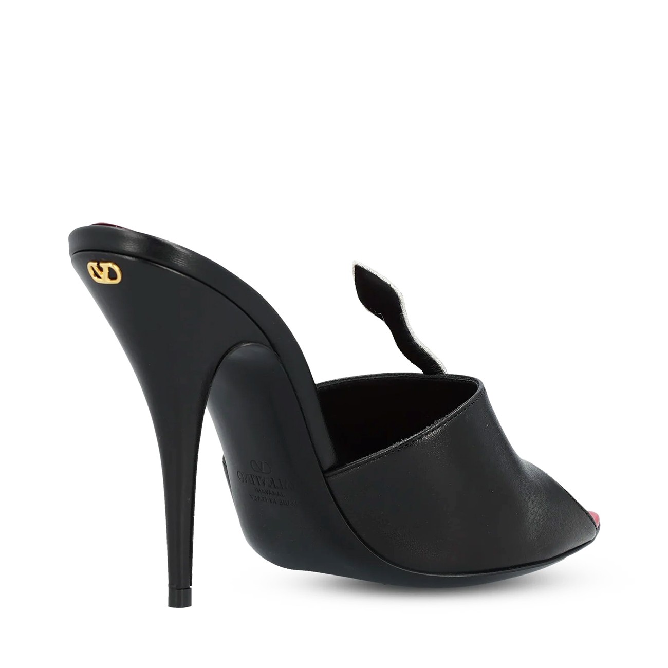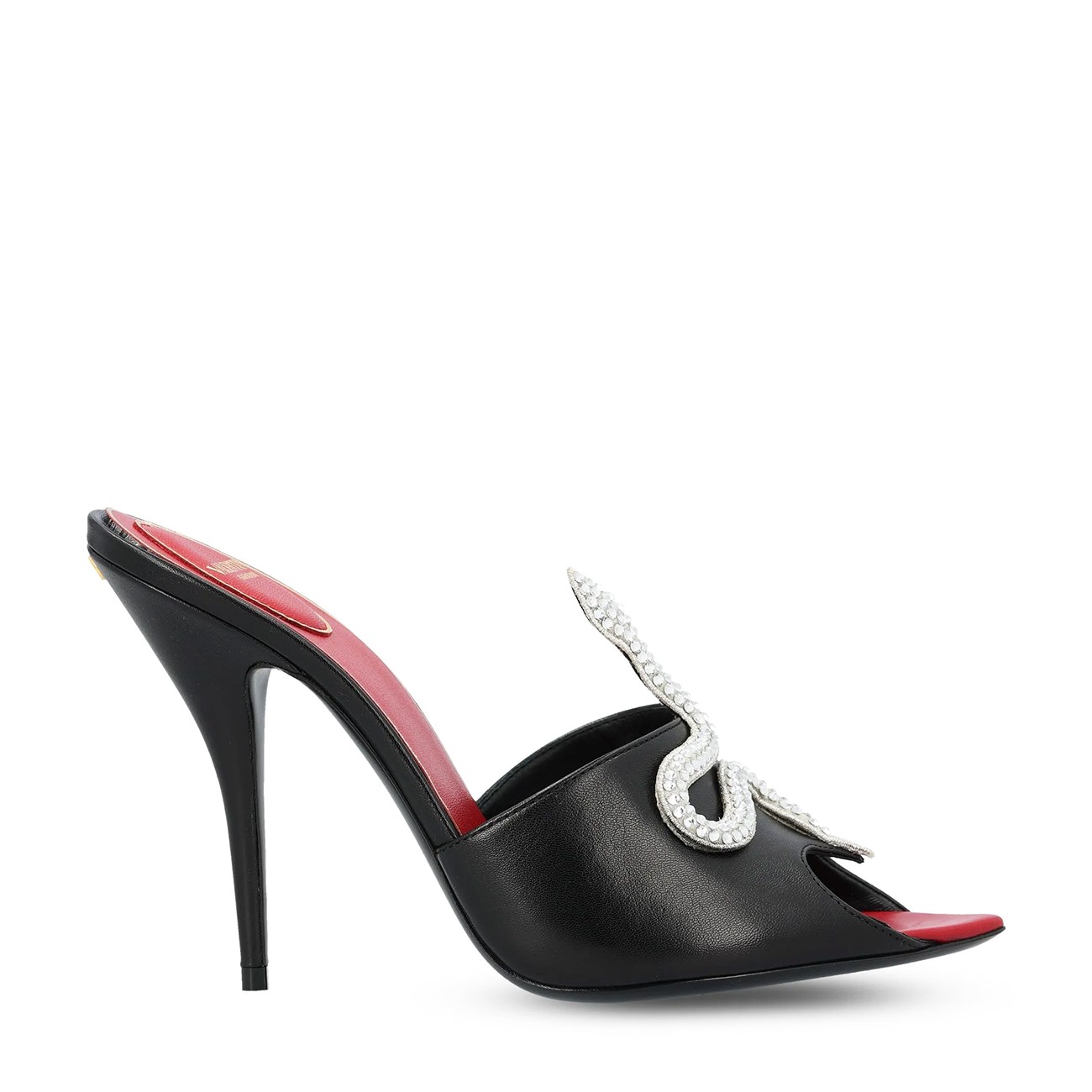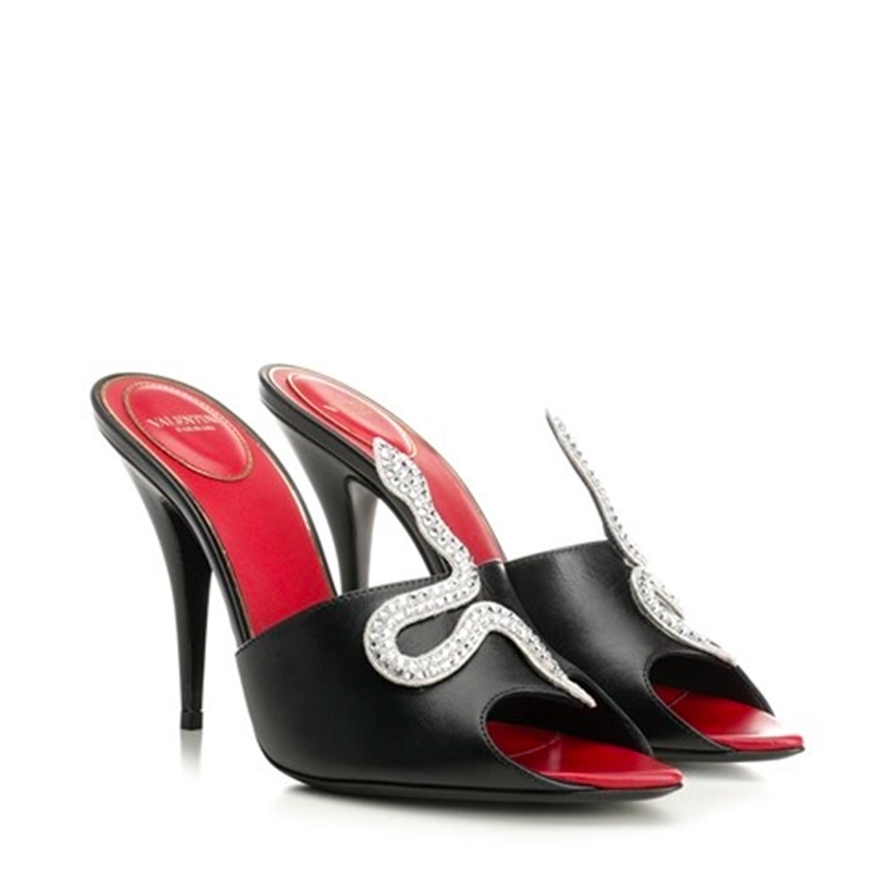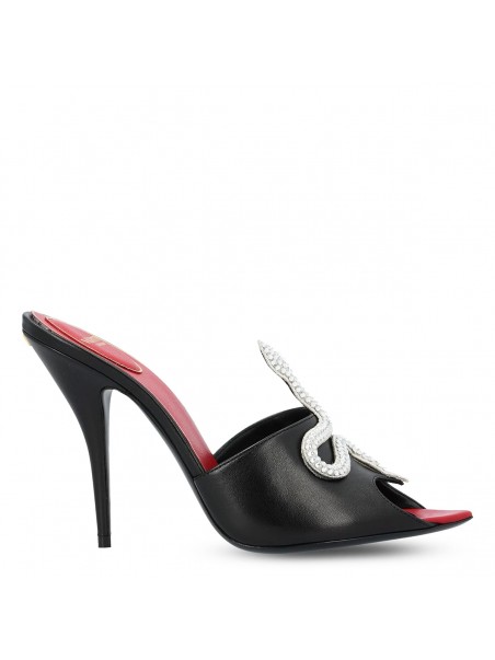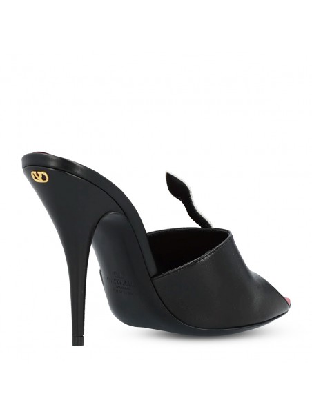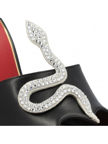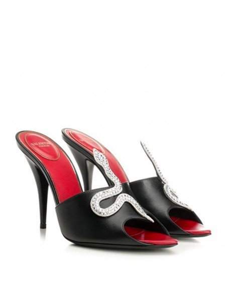 Black leather sandals from Valentino Garavani featuring round open toe, stiletto heel, snake embellishment, open back and branded insole.