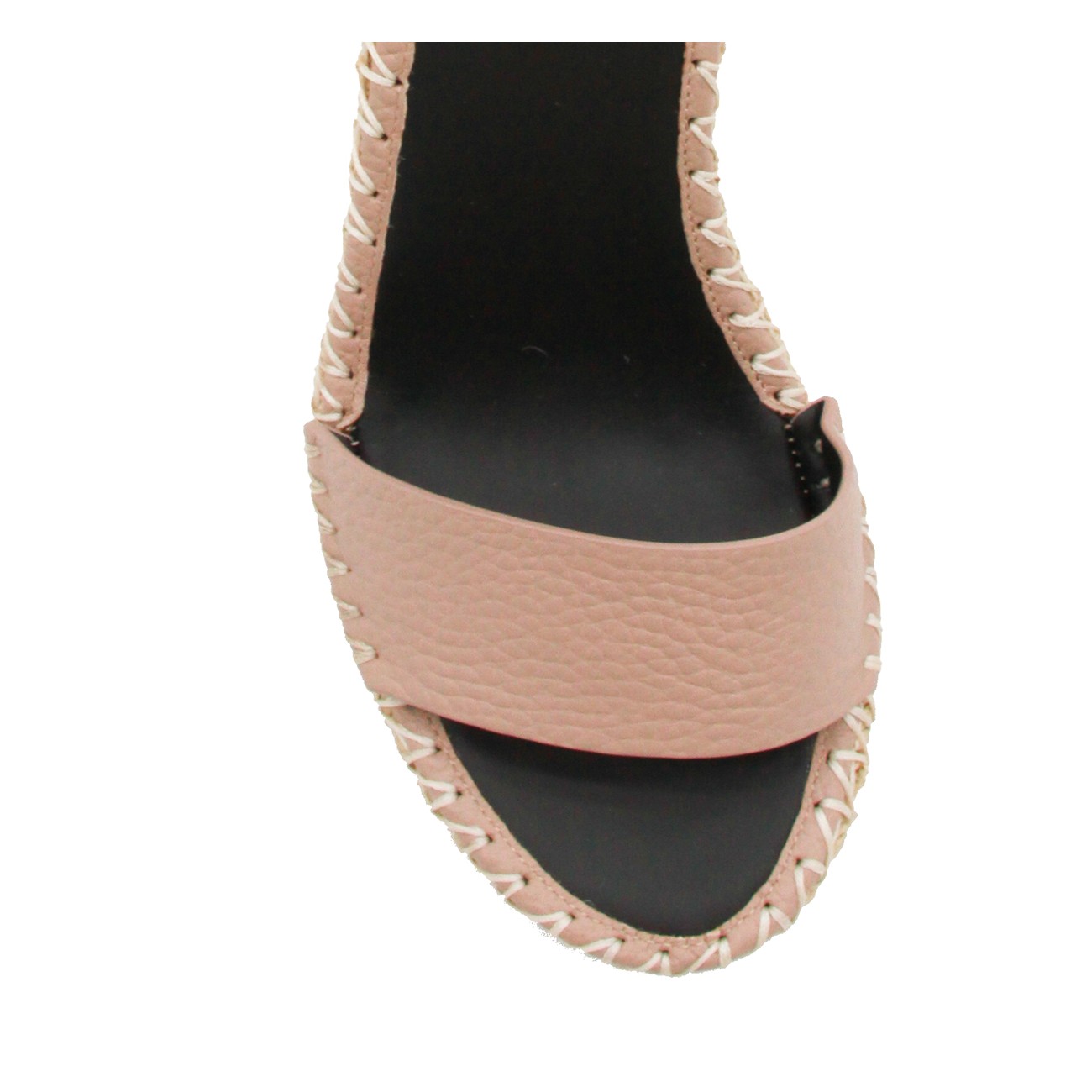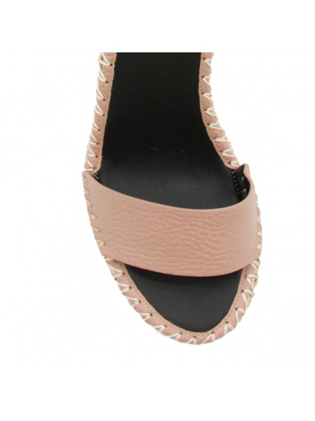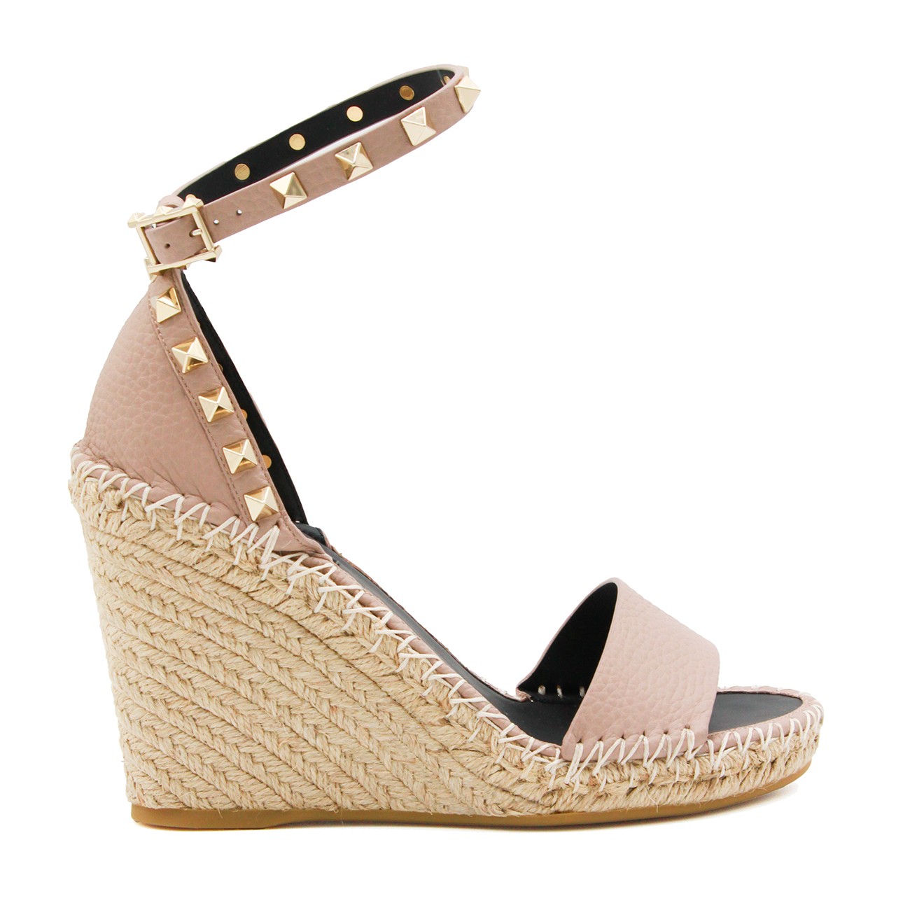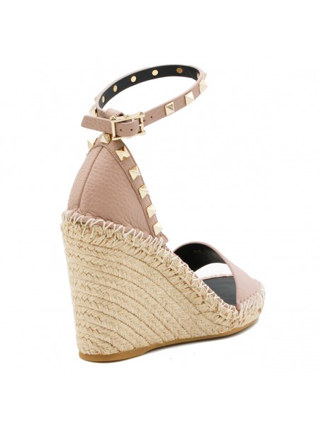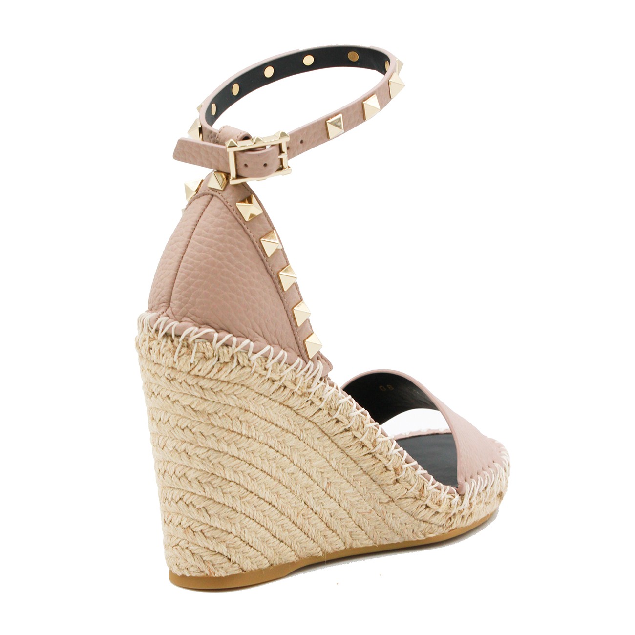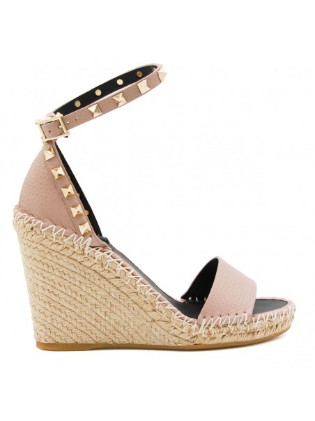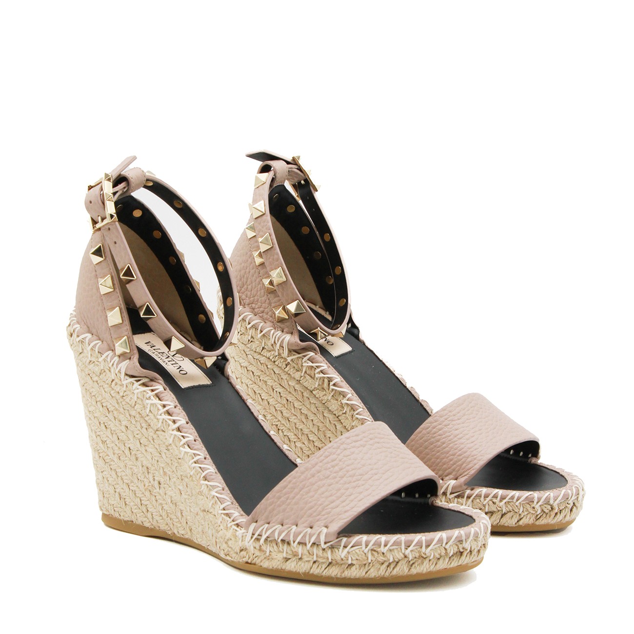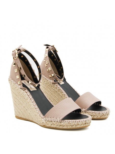 Beige leather sandals from Valentino Garavani featuring round open toe, studs, raffia wedge, ajustable ankle strap and rubber sole.