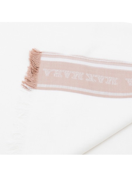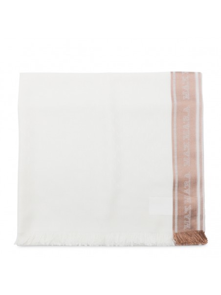 White and beige silk scarves from Max Mara featuring square shape, fringed hem and logo.
