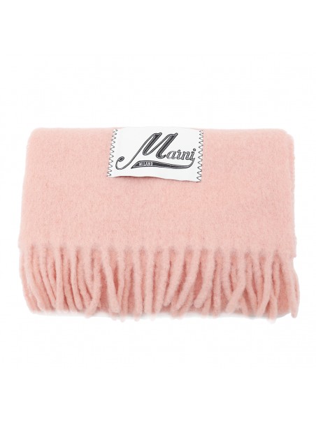 Pink wool scarves from Marni featuring fringe pattern and patched logo.