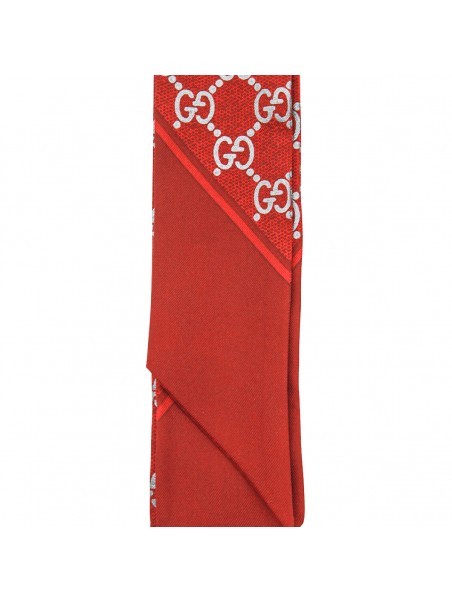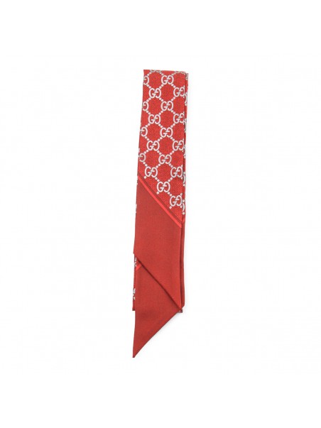 Red silk scarves from Gucci featuring logo print and rectangular shape.