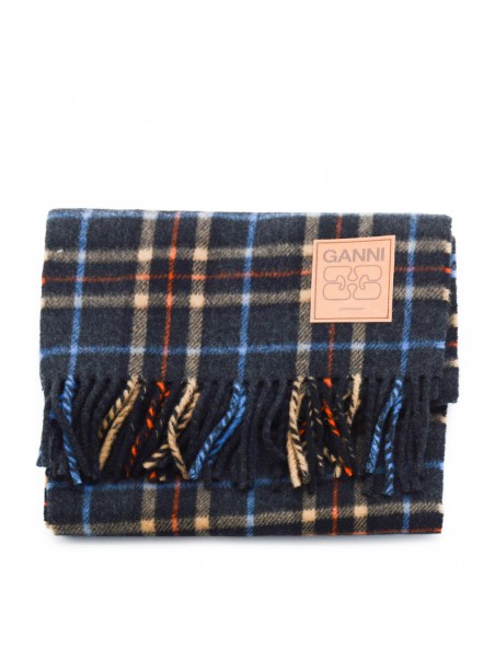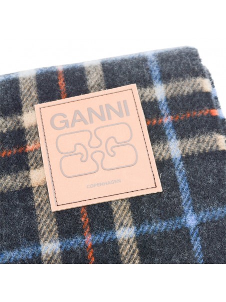 Multicolor wool scarf from Ganni featuring wool, fringed hem and logo patch.