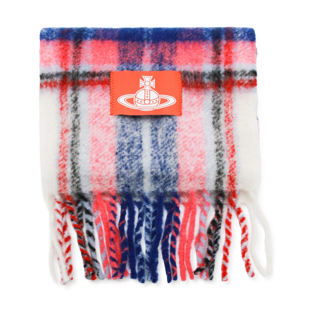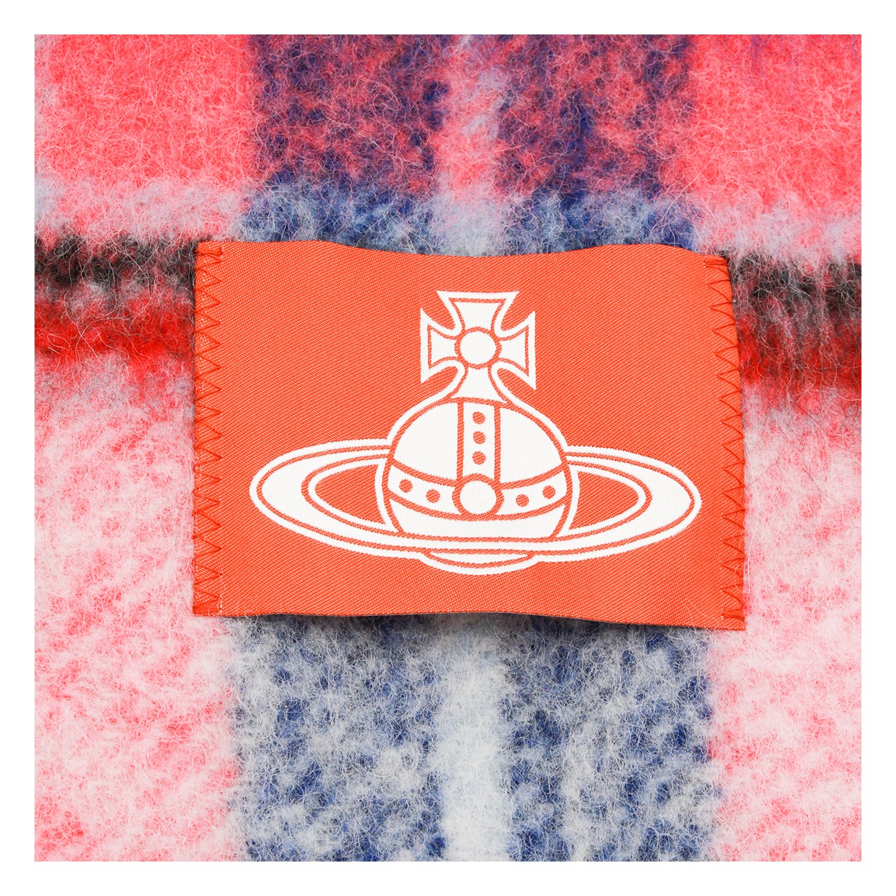 Pink and multicolor scarves from Vivienne Westwood featuring fringed hem, logo patch and print decoration.