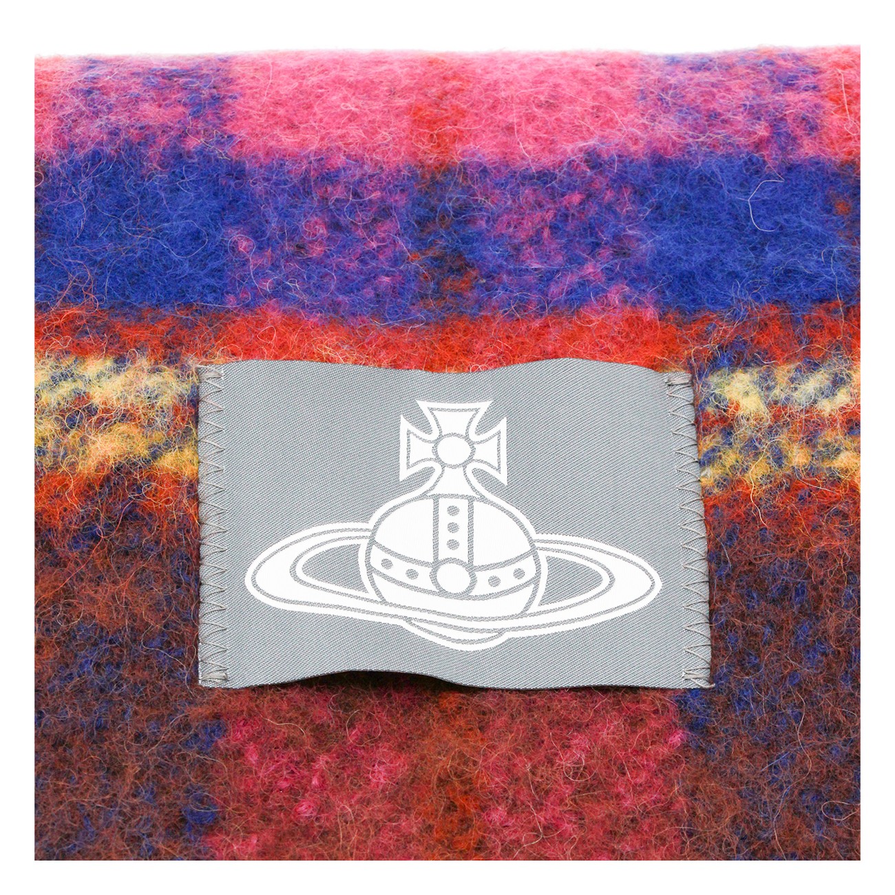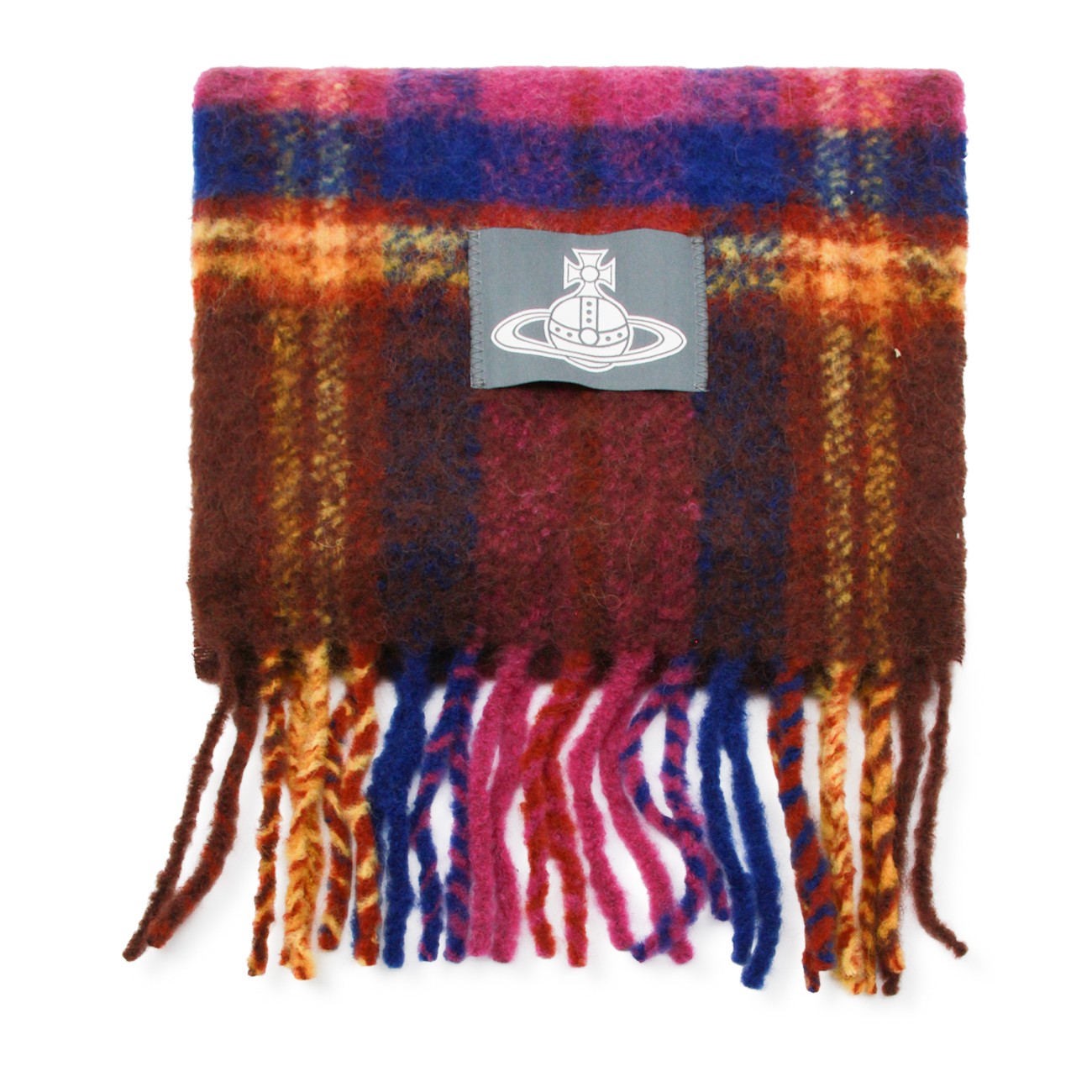 Purple and multicolor scarves from Vivienne Westwood featuring fringed hem, logo patch and print decoration.