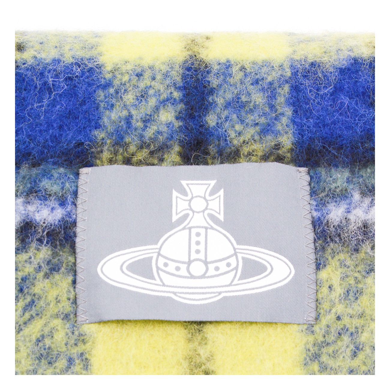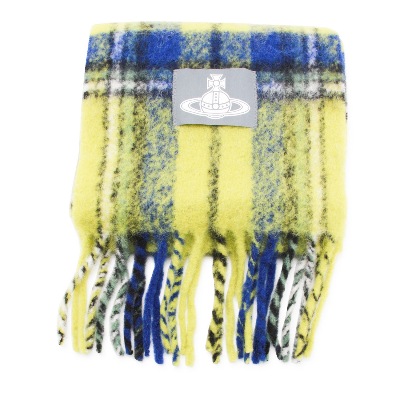 Yellow and multicolor scarves from Vivienne Westwood featuring fringed hem, logo patch and print decoration.