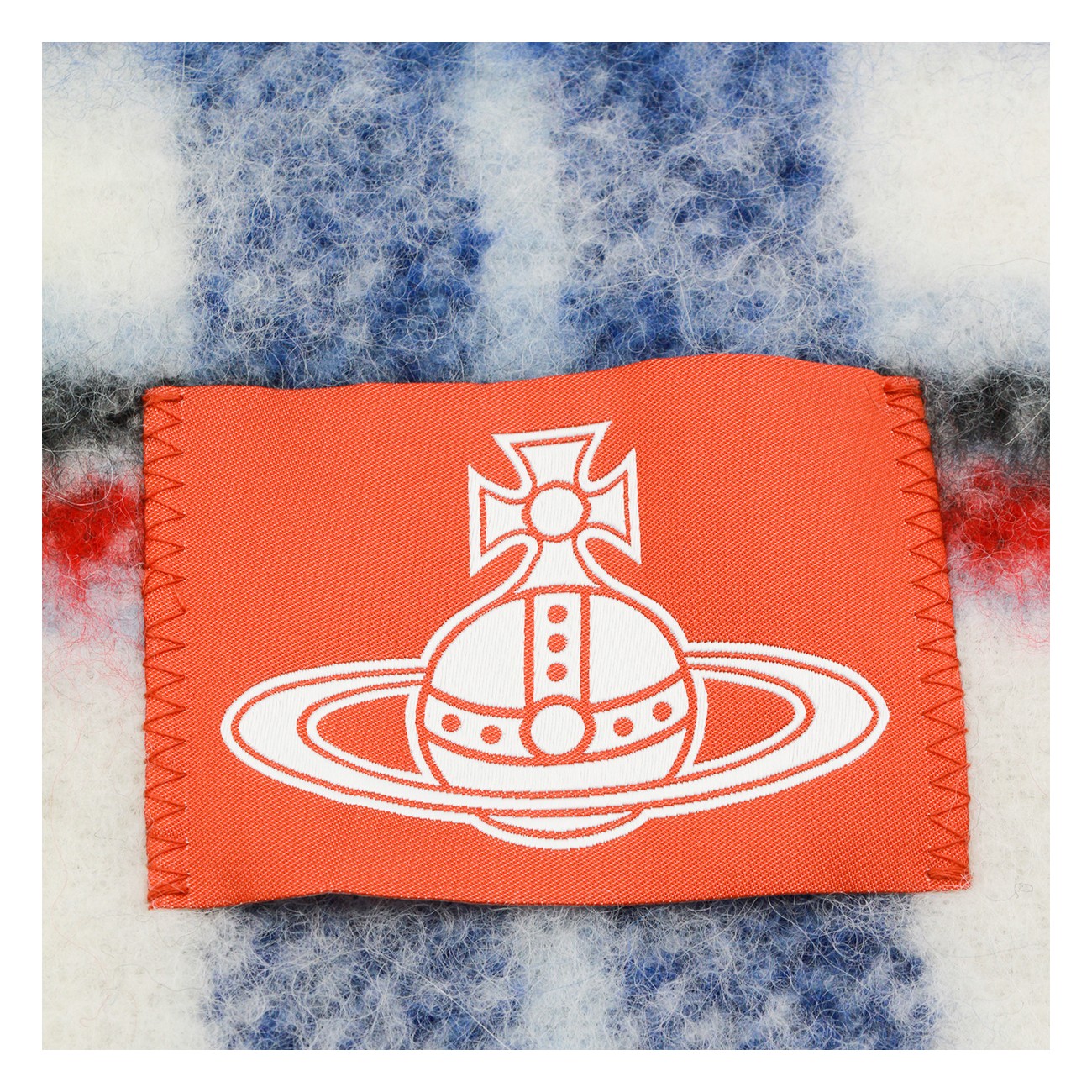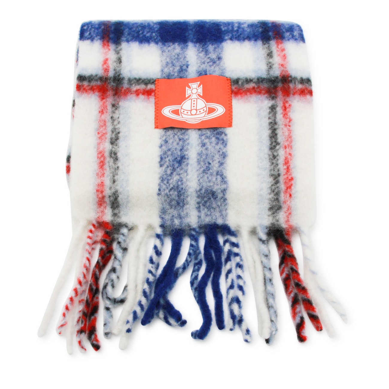 Multicolor scarves from Vivienne Westwood featuring fringed hem, logo patch and print decoration.