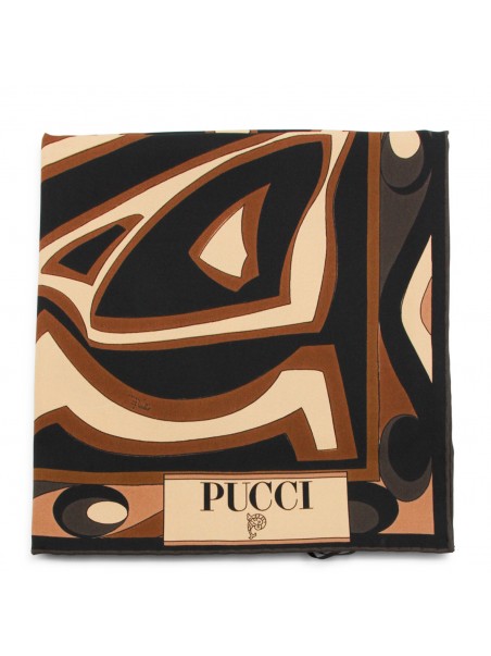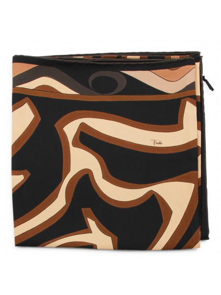 Black and gold silk scarf from Emilio Pucci featuring all-over print, logo and silk.