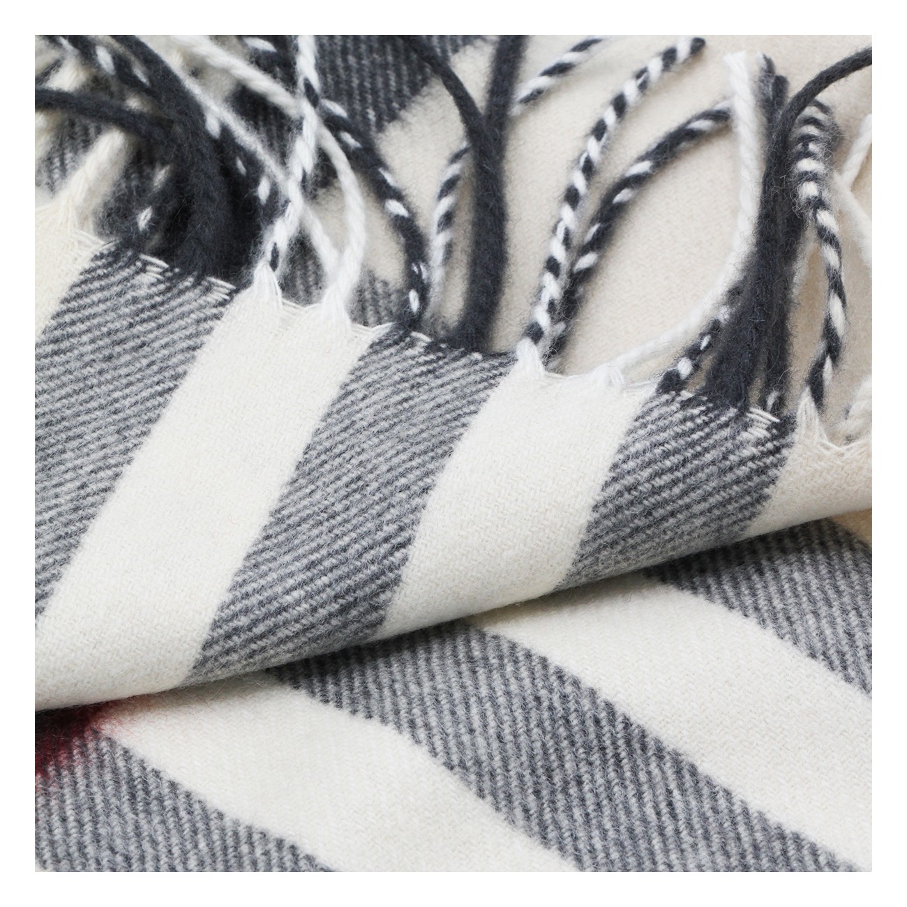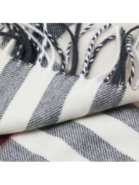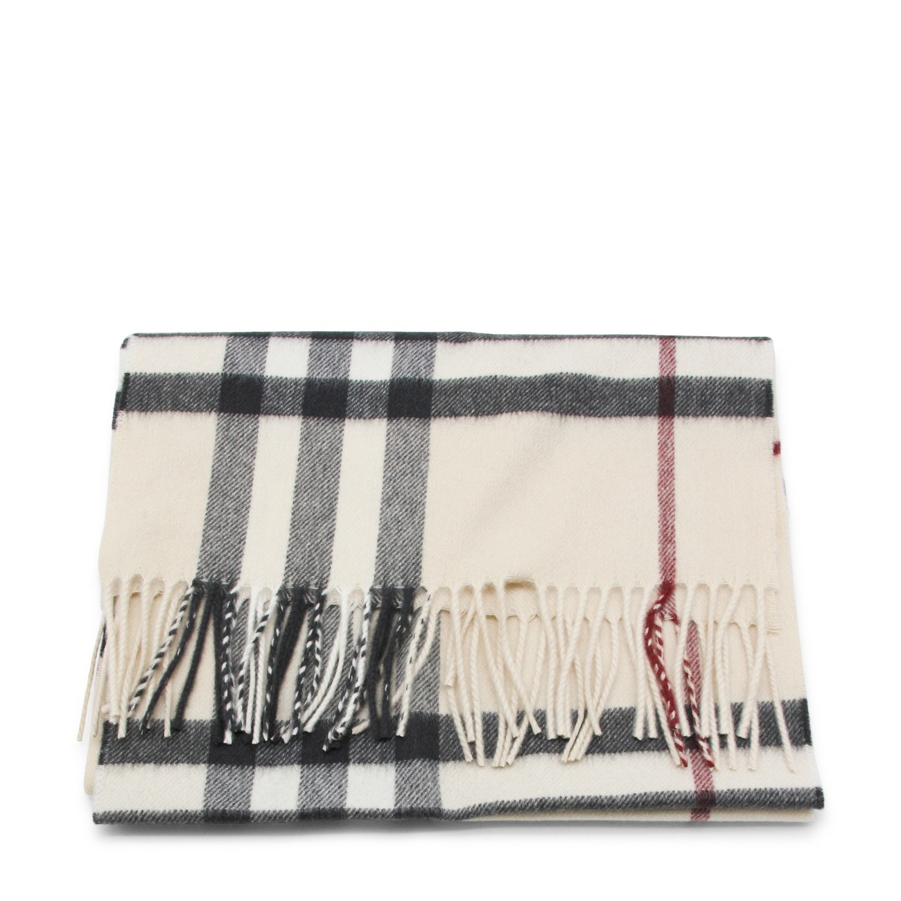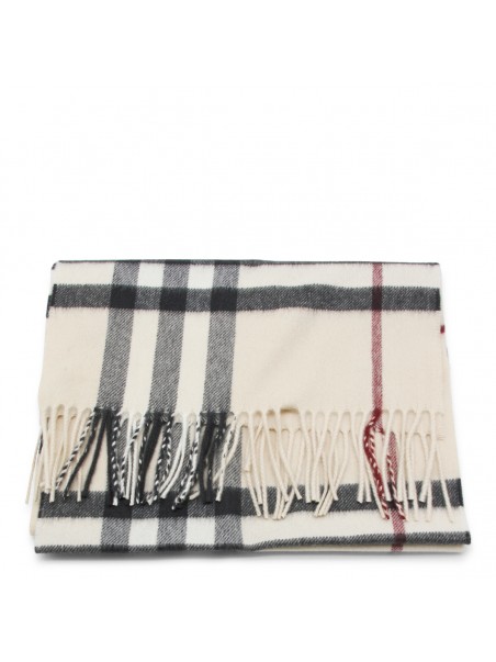Stone cashmere scarf from Burberry featuring iconic pattern and fringes.