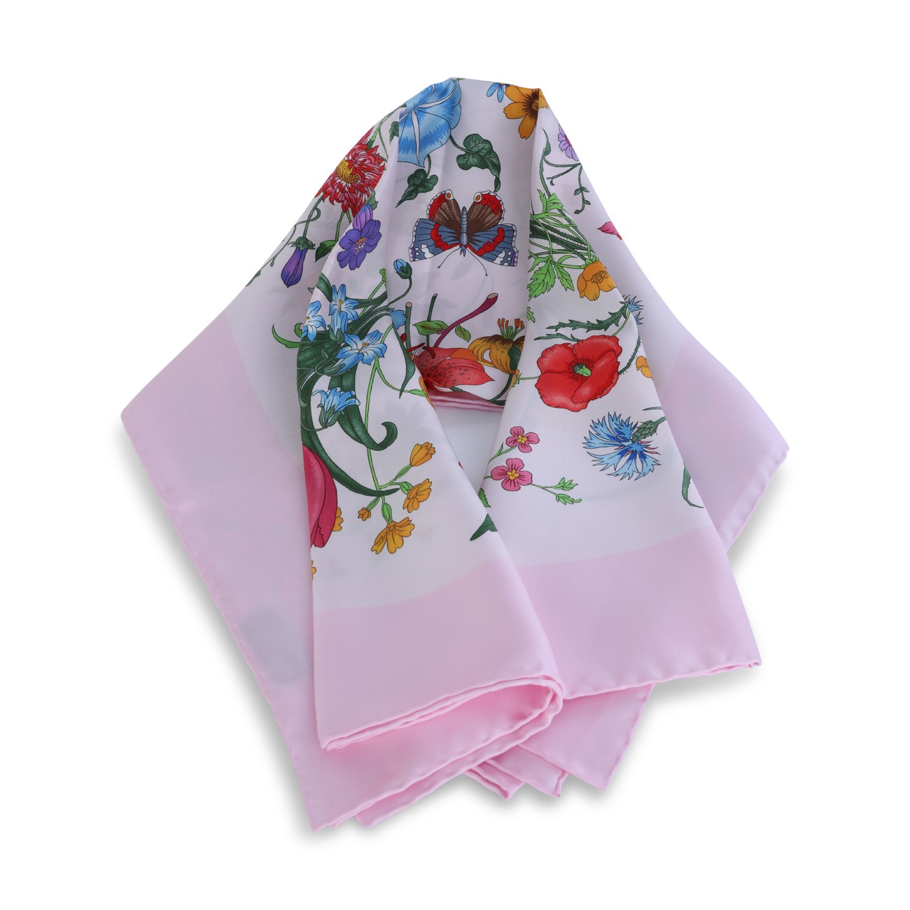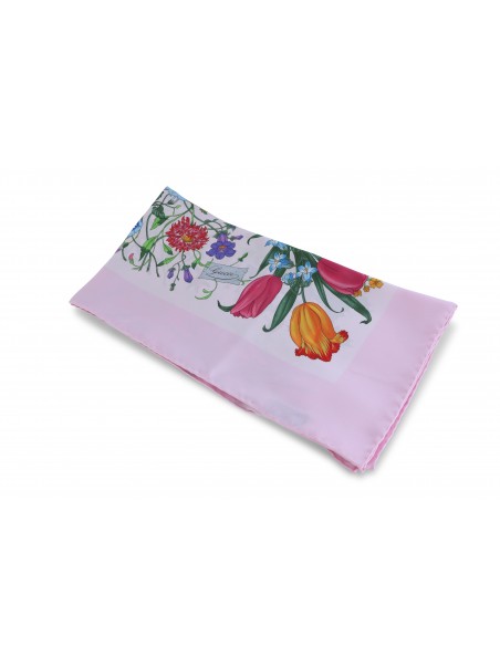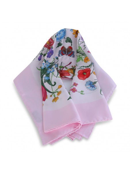 Pink silk scarf from Gucci featuring all over floral stamp.