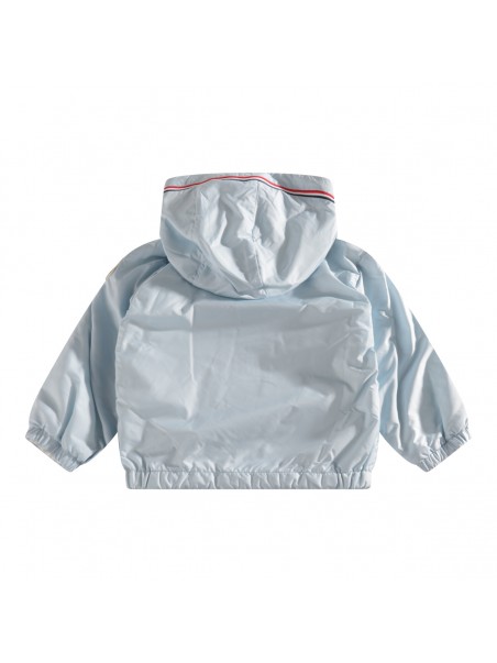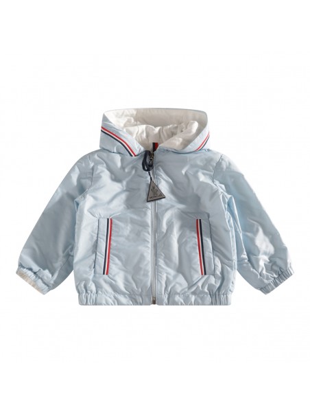 Light blue casual jacket from Moncler featuring long sleeves, hood, zip fastening, pockets and regular vestibility.