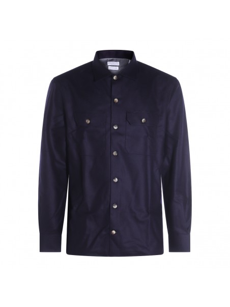 Navy wool shirt from Brunello Cucinelli featuring shirt collar, long sleeves, frontal buttons fastening, chest pockets and regular vestibility.