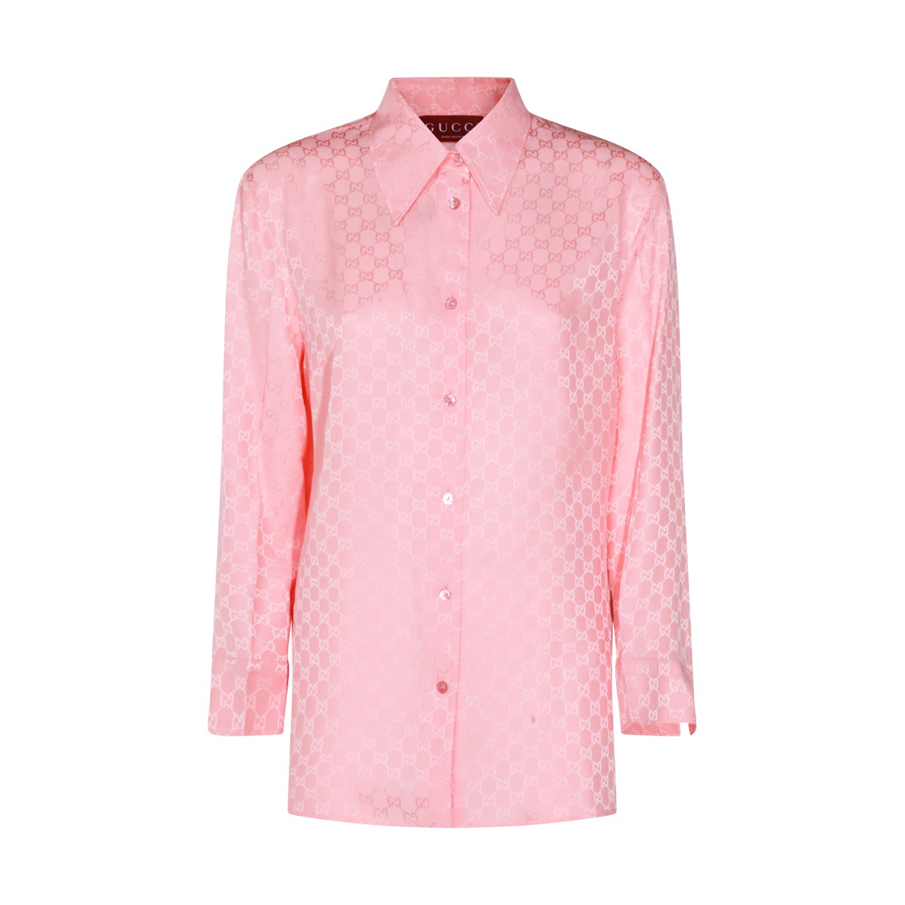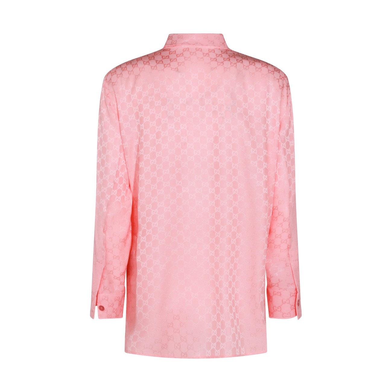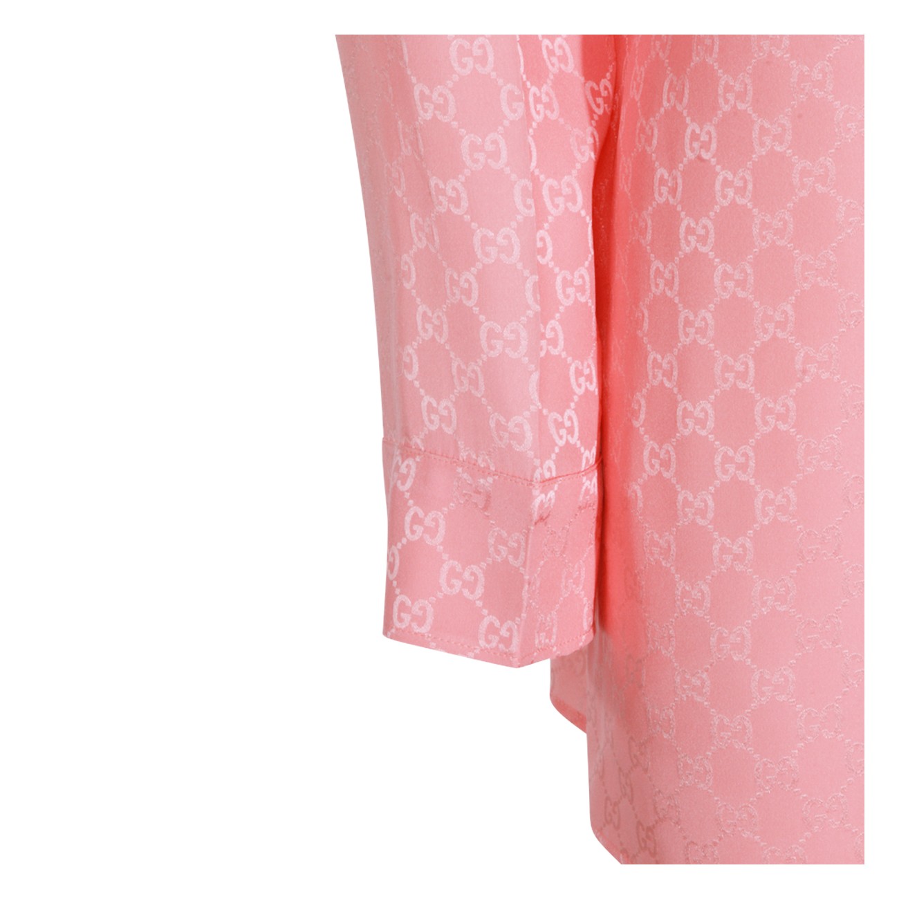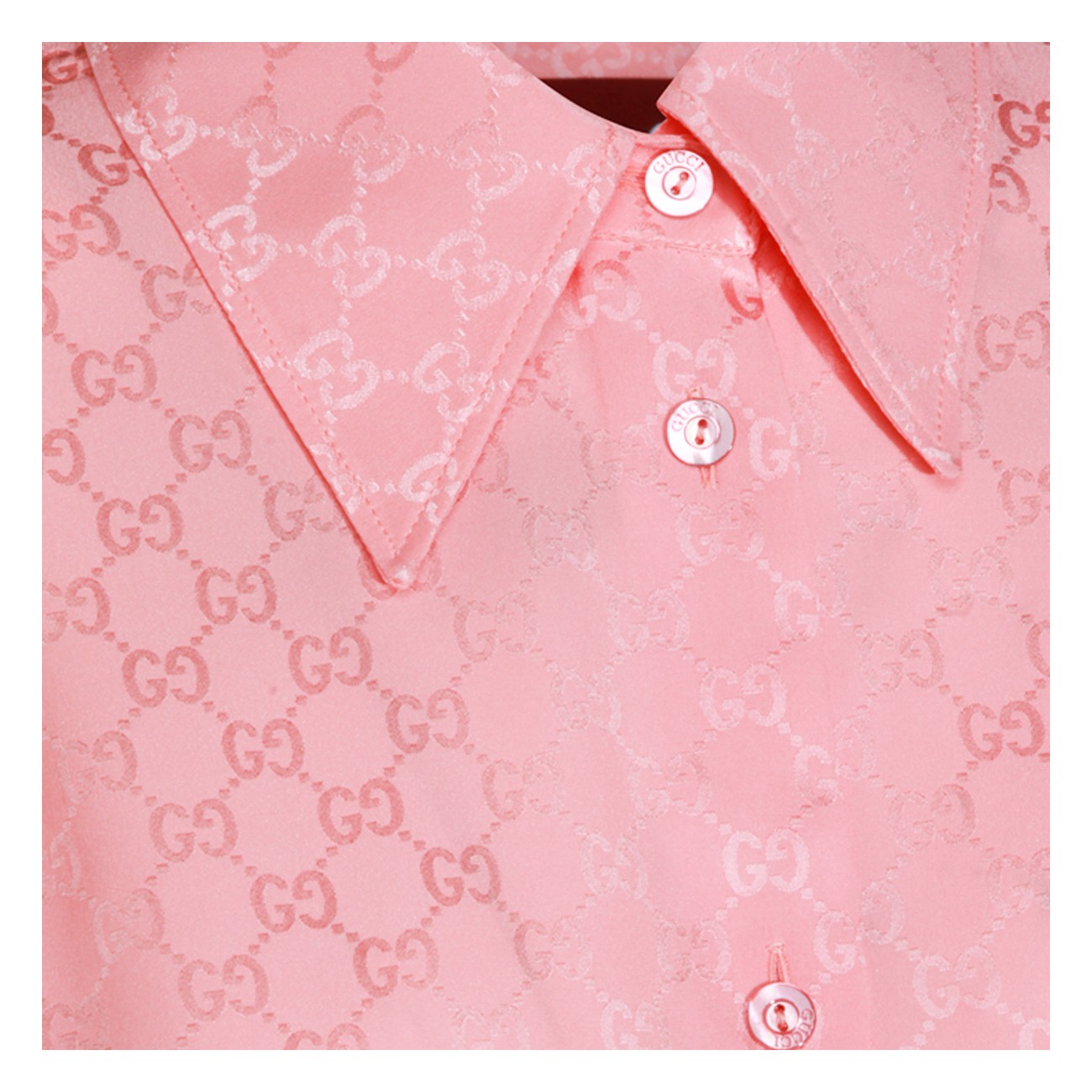 Pink silk shirt from Gucci featuring classic shirt collar, long sleeves, all-over GG logo texture, buttons fastening and regular vestibility.