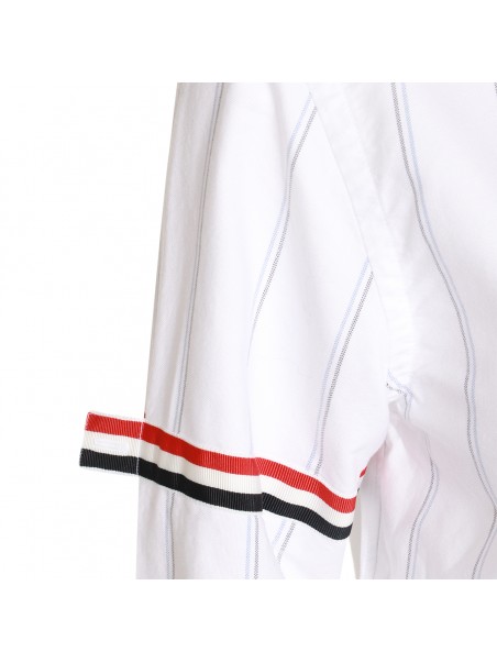 White cotton shirt from Thom Browne featuring classic collar, buttons fastening, long sleeves, logo, stripes details and cropped length.