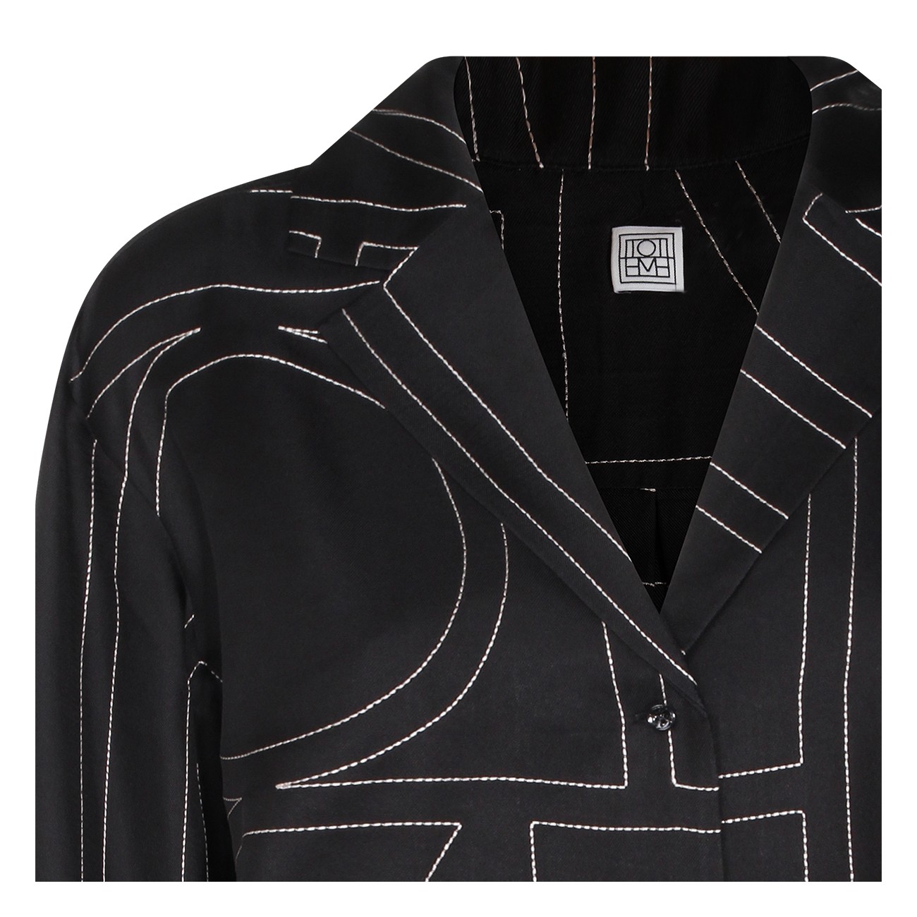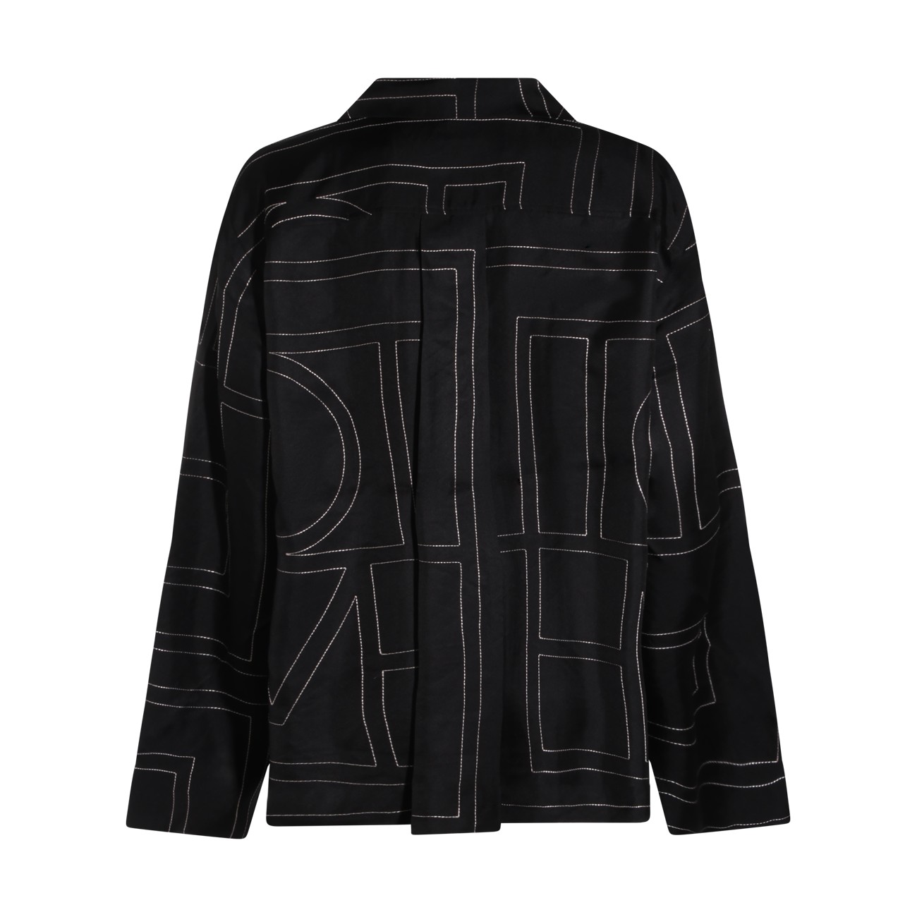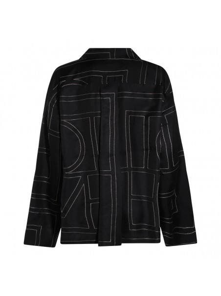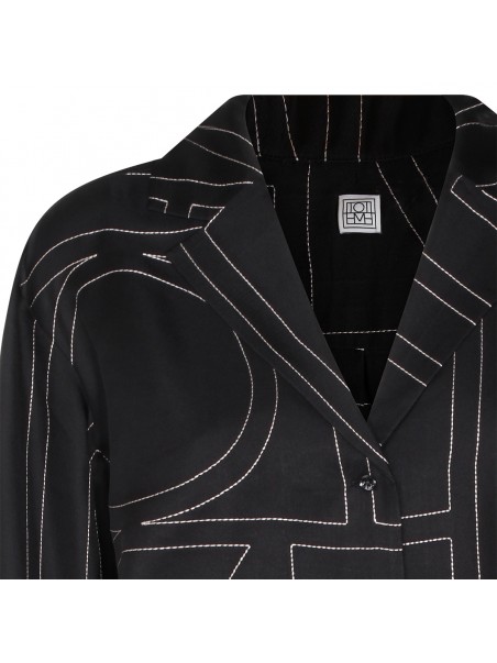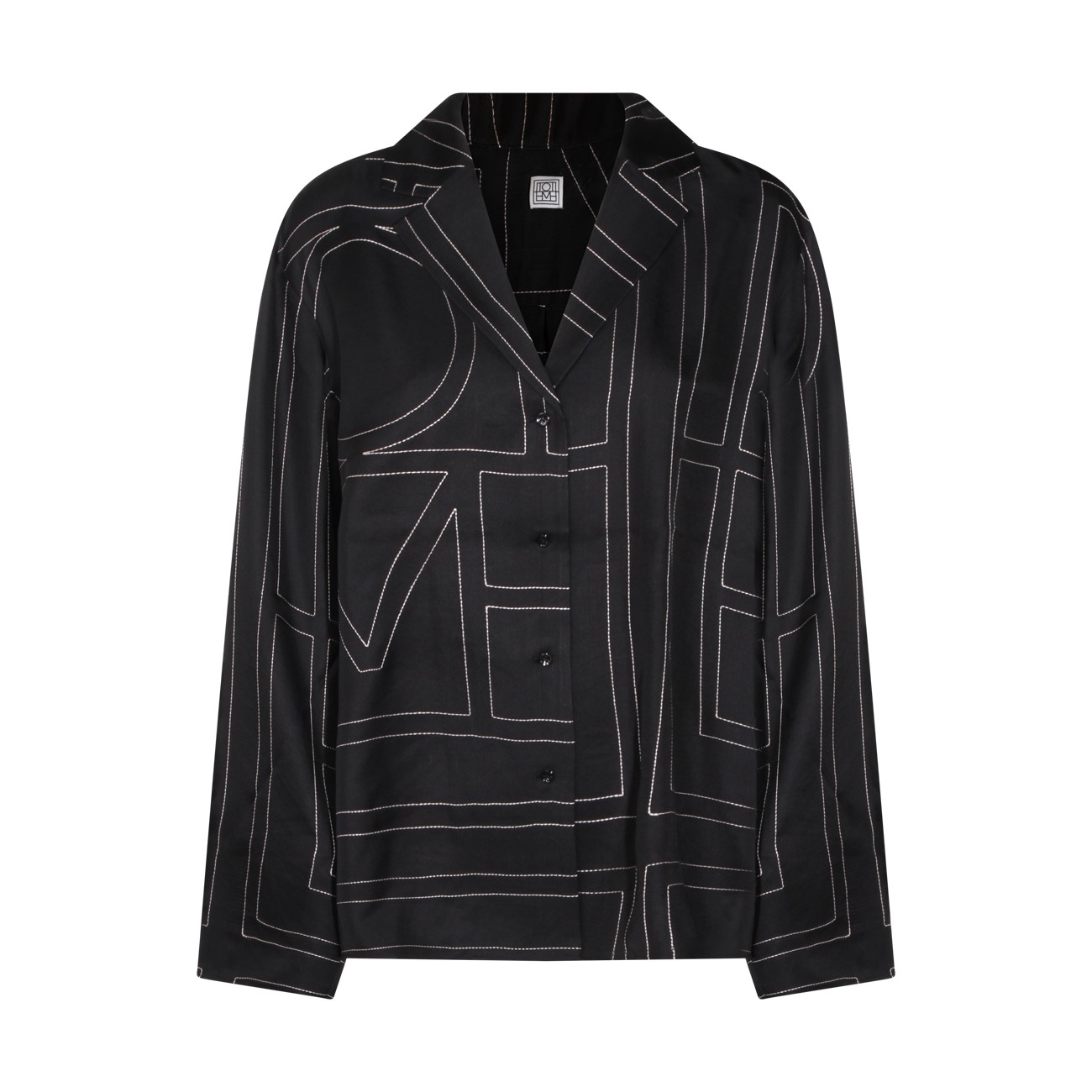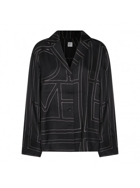 Black silk shirt from Toteme featuring regular V-neck, buttons fastening, long sleeves, all over stitching details and regular vestibility.