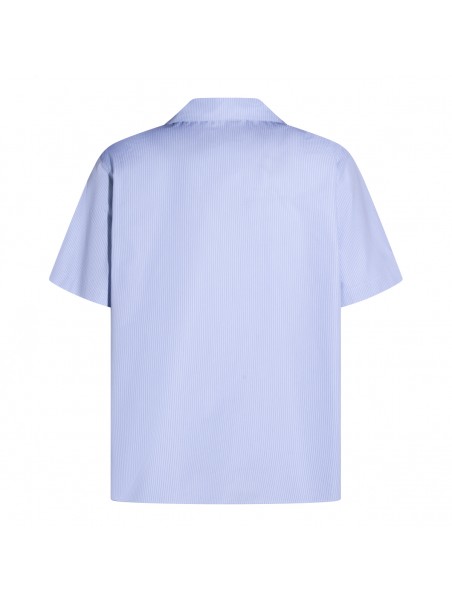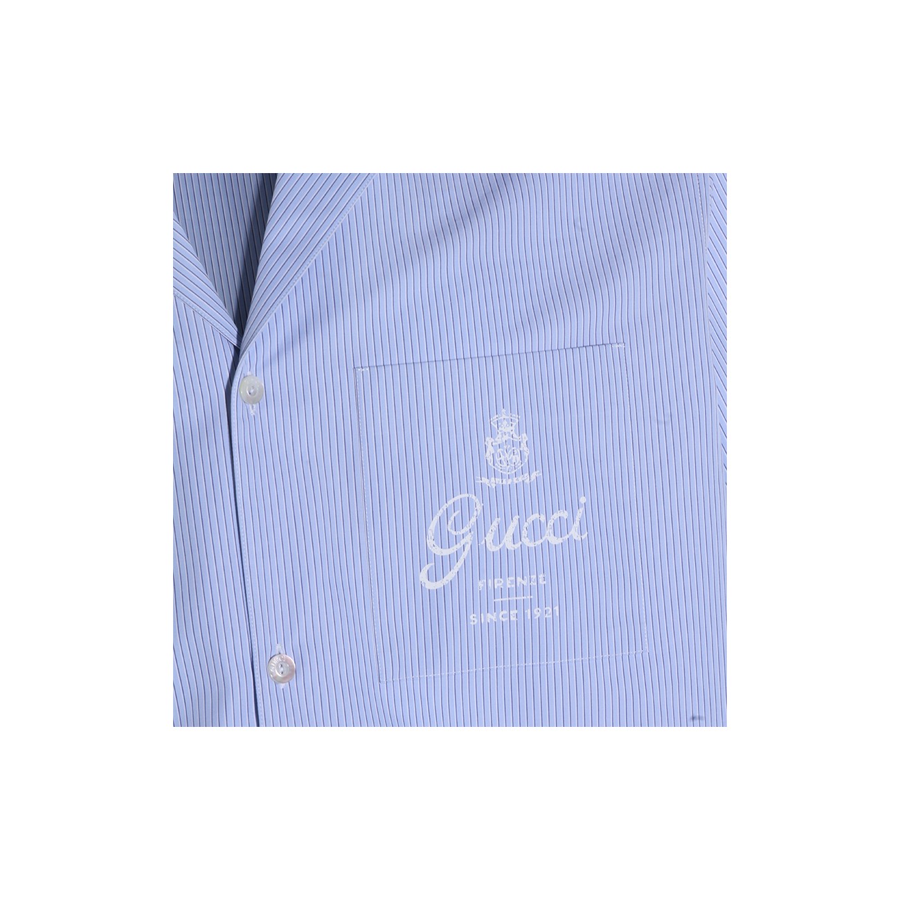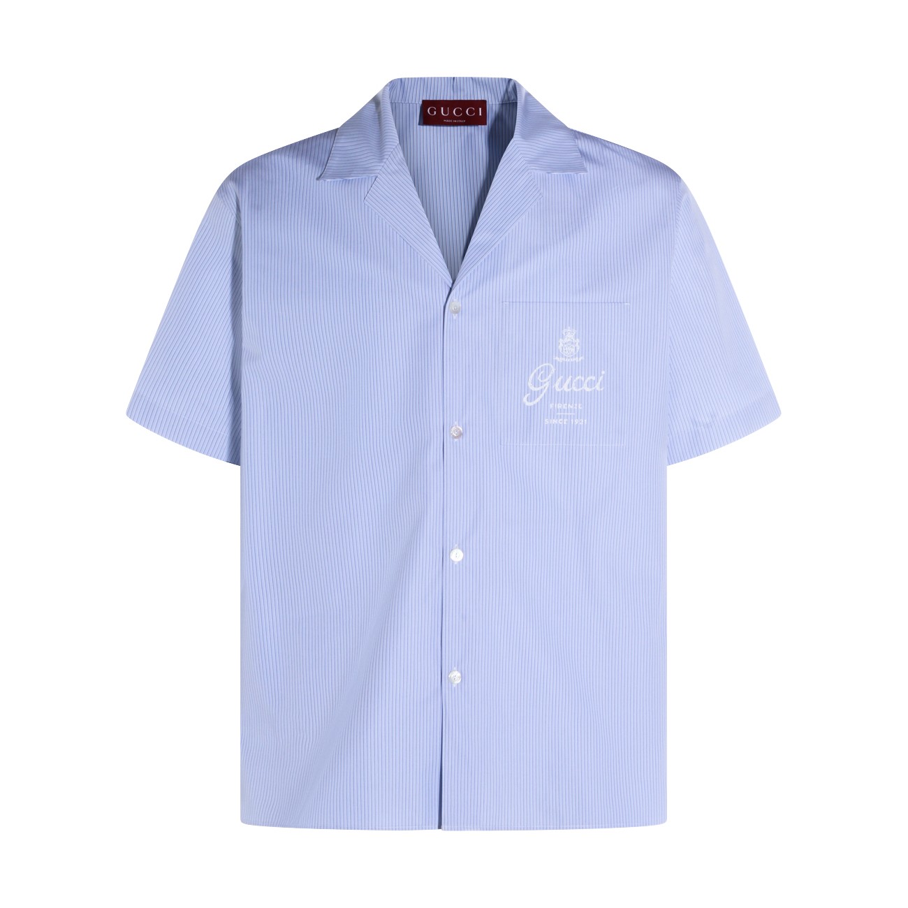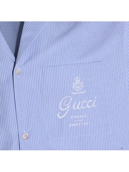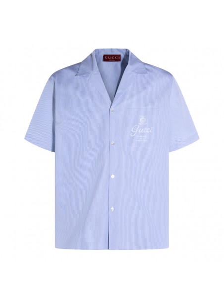 Light blue cotton shirt from Gucci featuring short sleeves, shirt collar, buttons fastening and frontal logo on pocket.