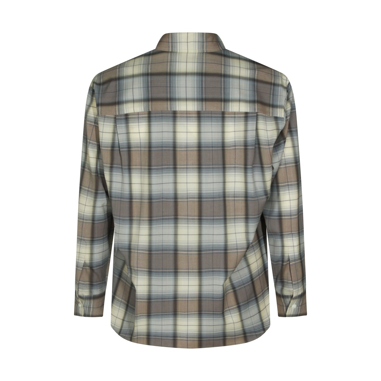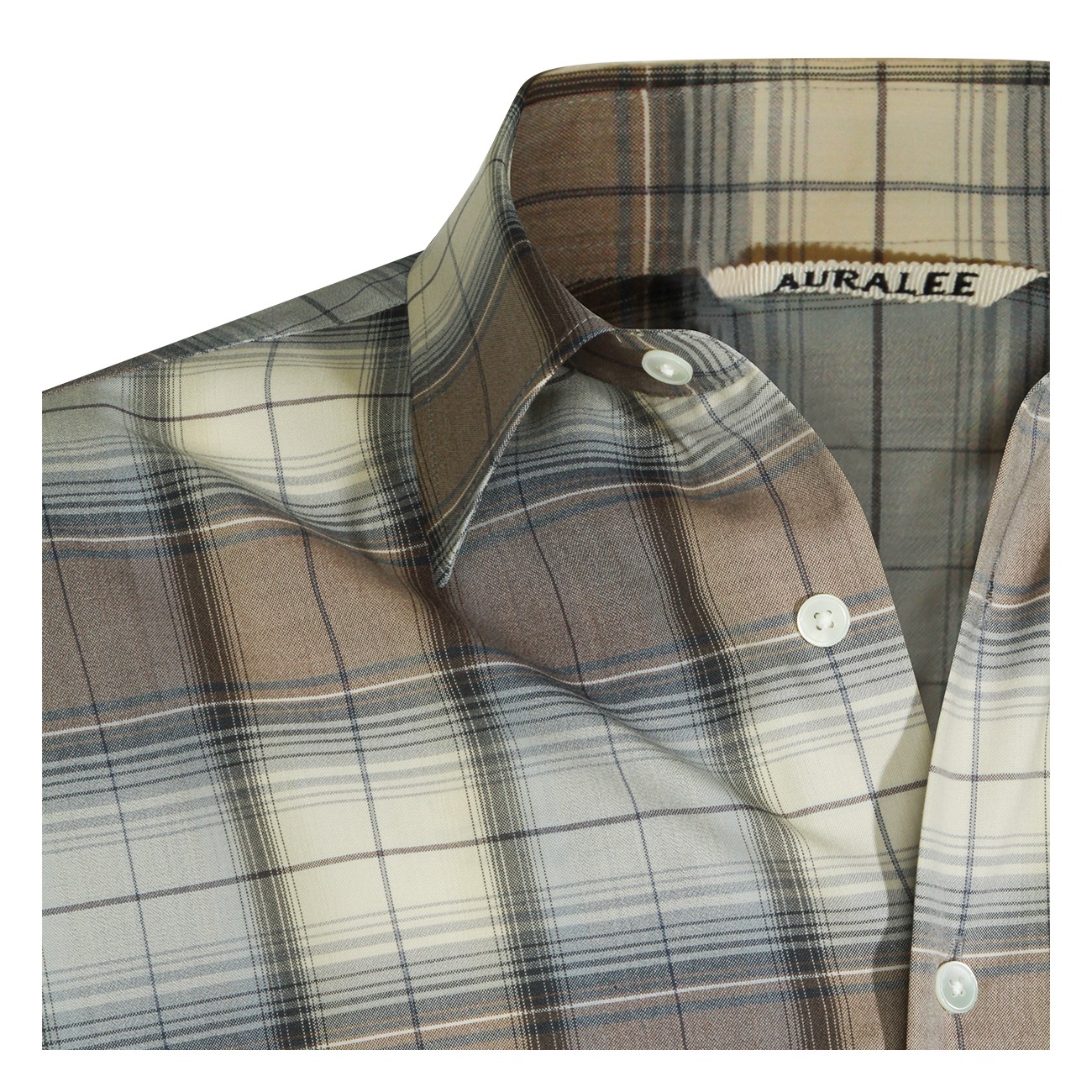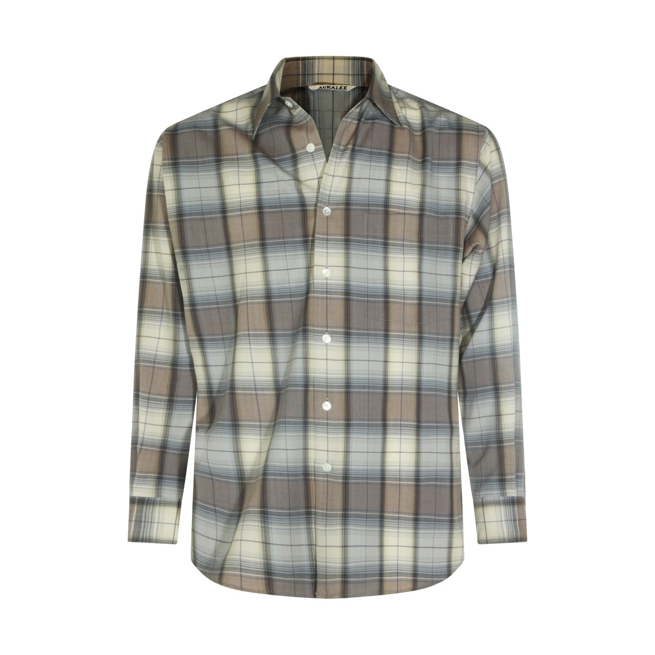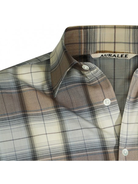 Grey and blue wool shirt from Auralee featuring long sleeves, shirt collar, round hem and buttons fastening.