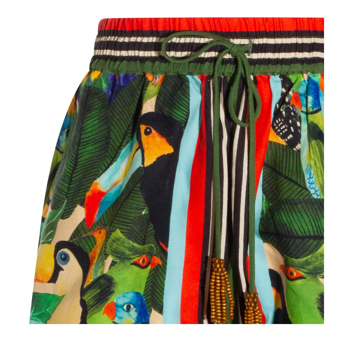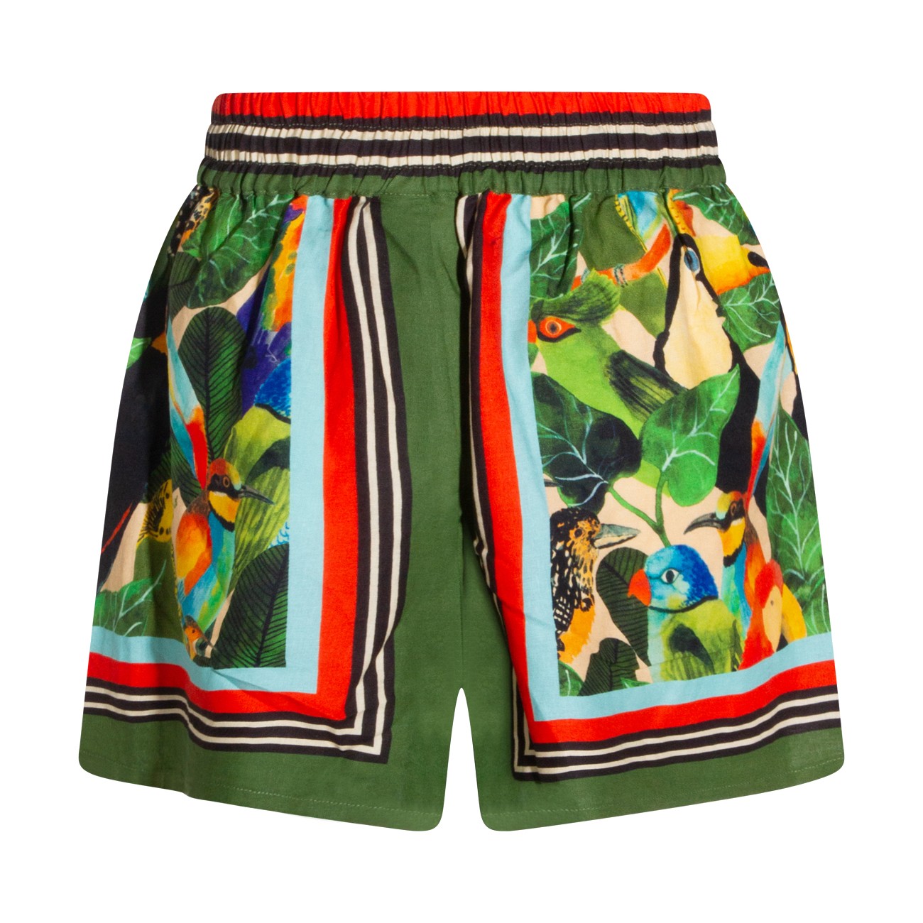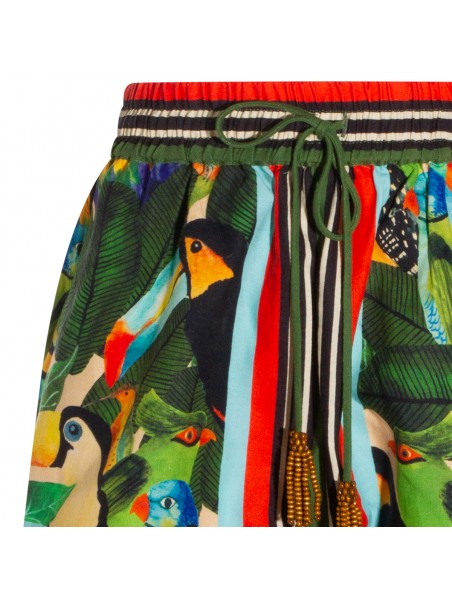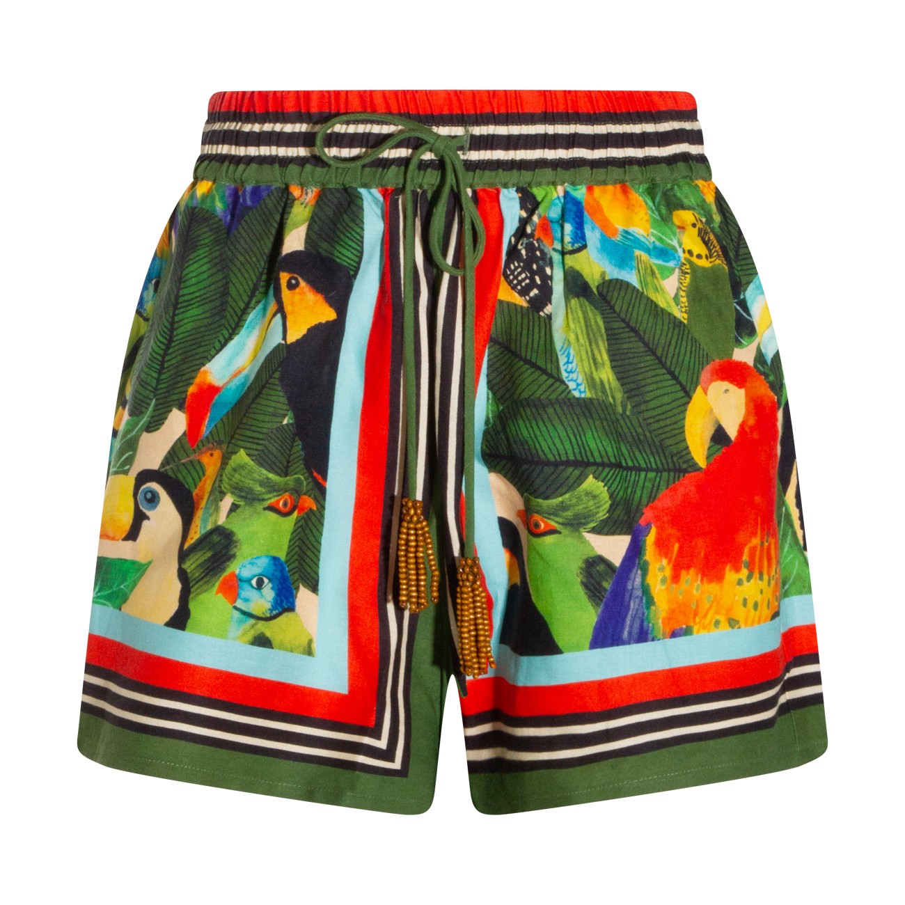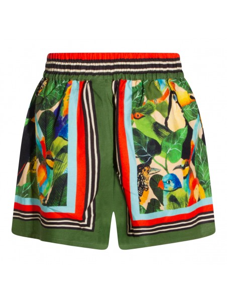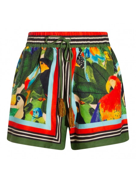 Green linen shorts from Farm Rio featuring elasticated waist, cotton lace-up fastening, all over stamp and short length.