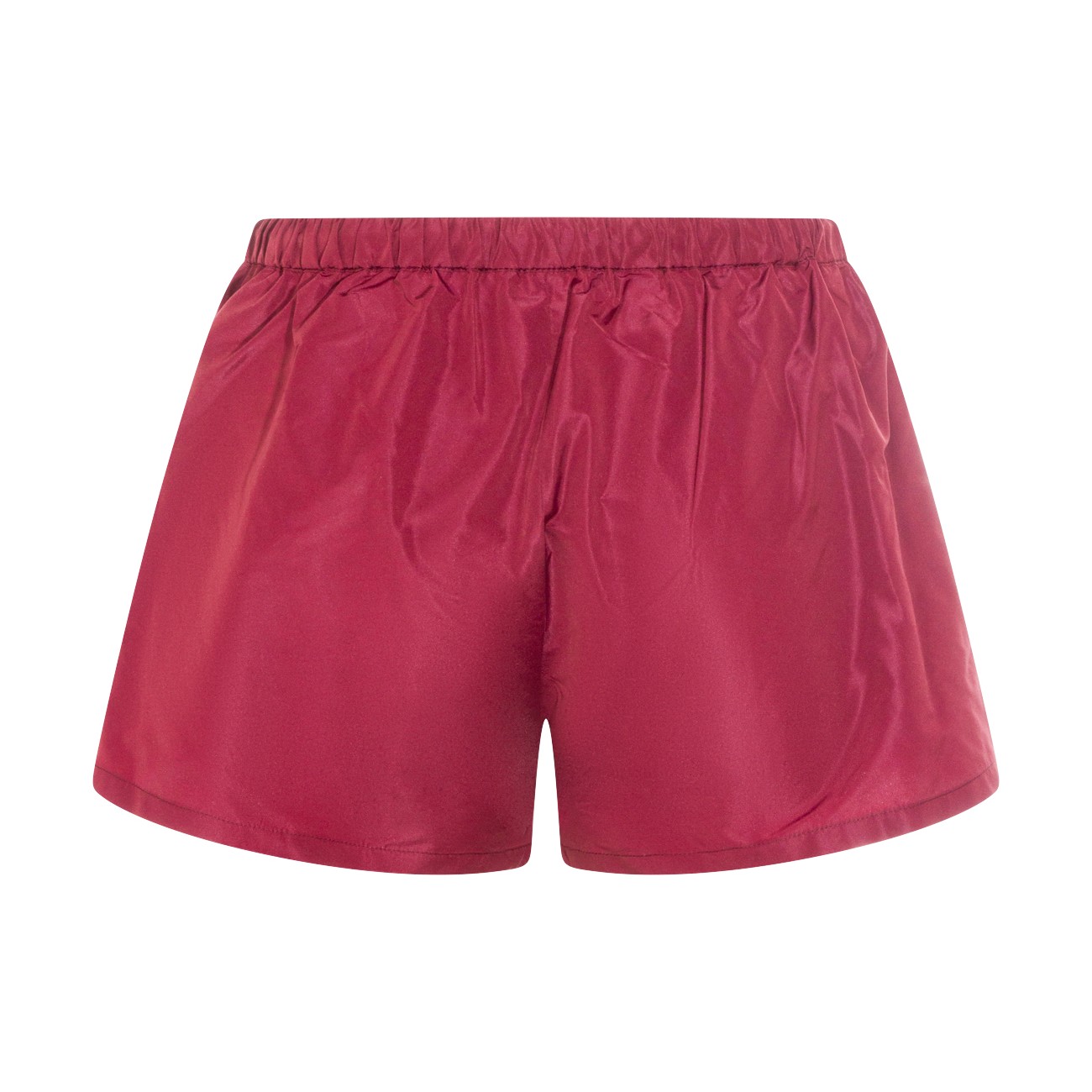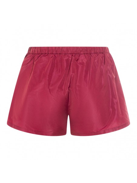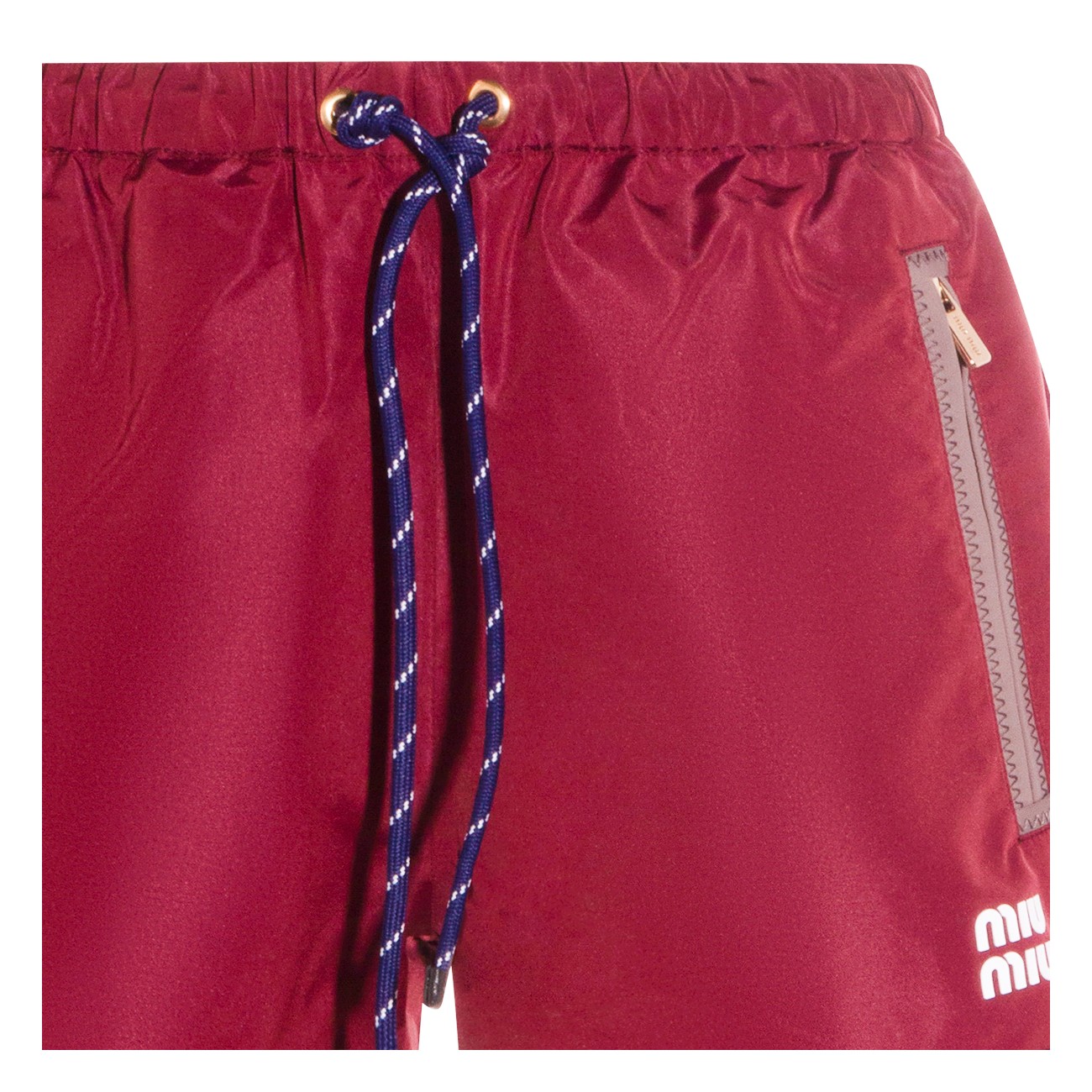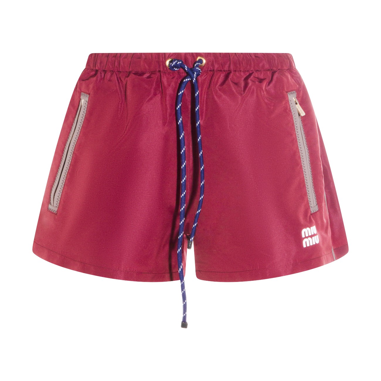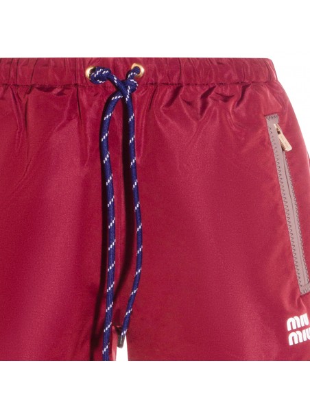 Red shorts from Miu Miu featuring elasticized drawstring waistband, zipper pockets, stitched hem, printed logo and regular fit.