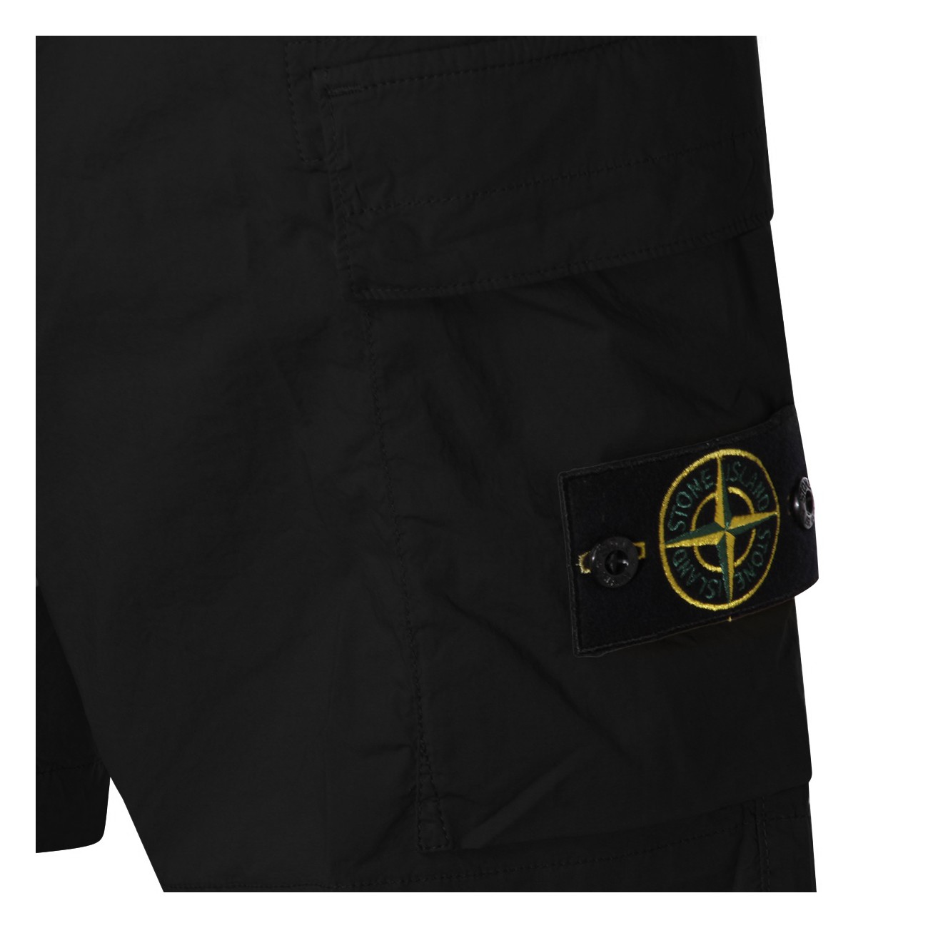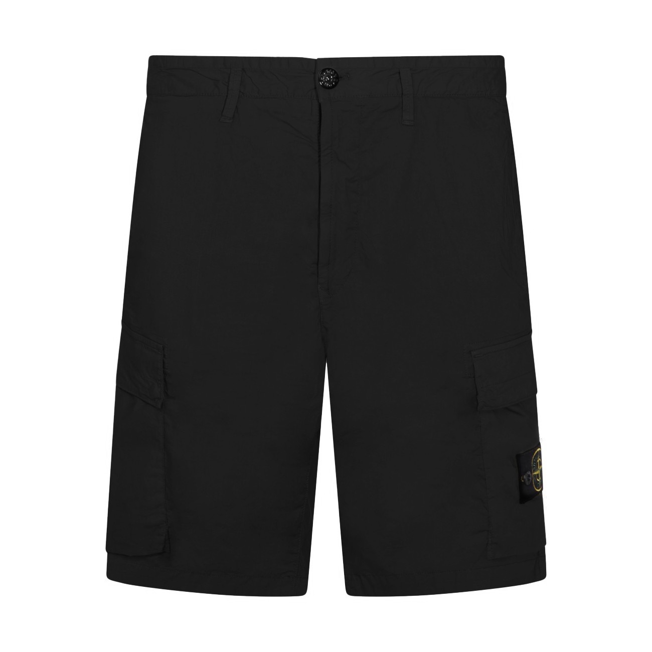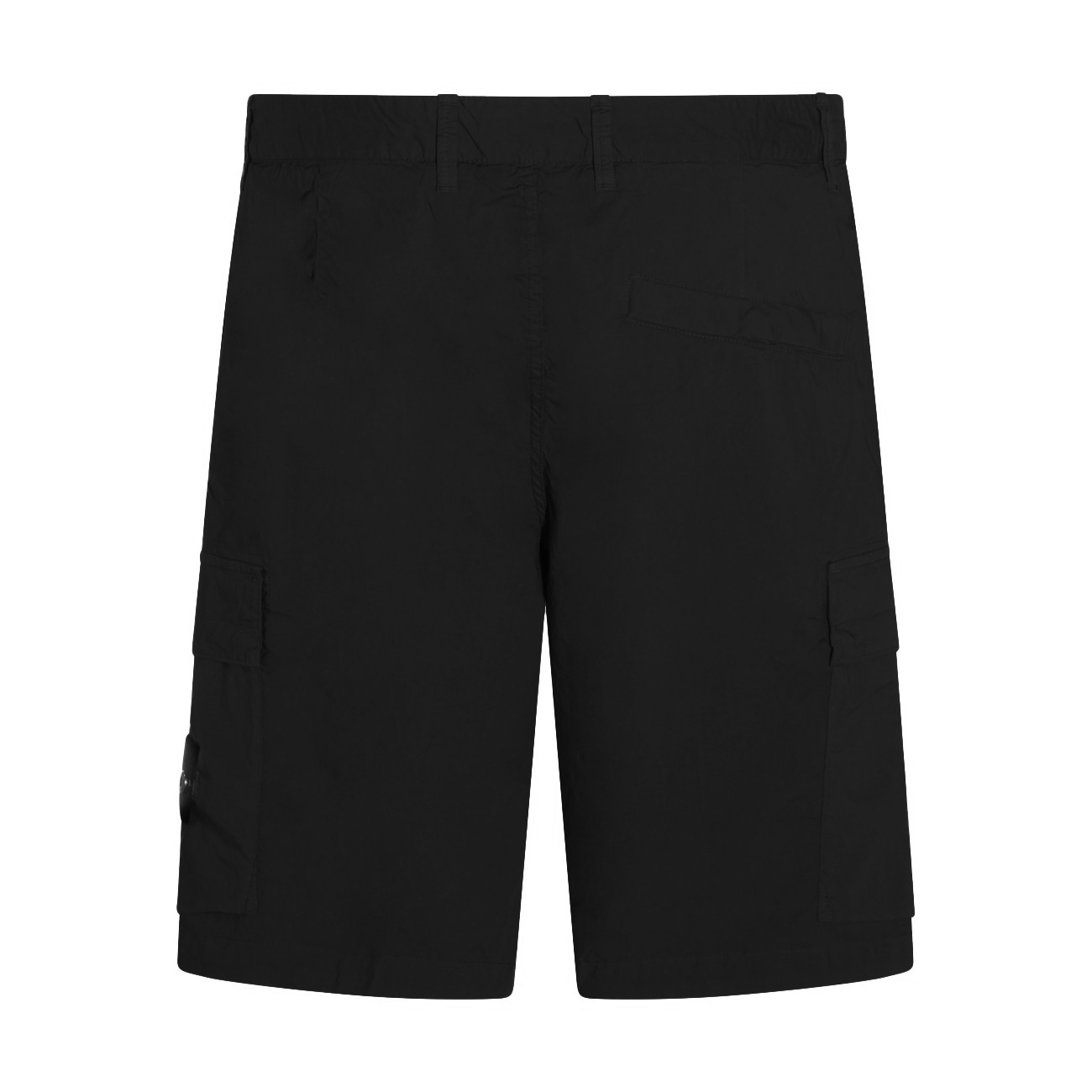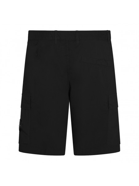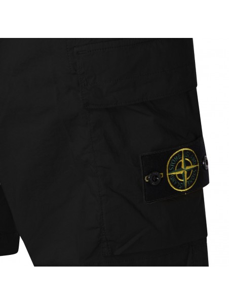 Black cotton shorts from Stone Island featuring mid wasit, belt loops, button and zip fastening, hidden zip pockets, cargo pockets with flaps, snap-button back pocket, lateral removable logo patch and regular vestibility.