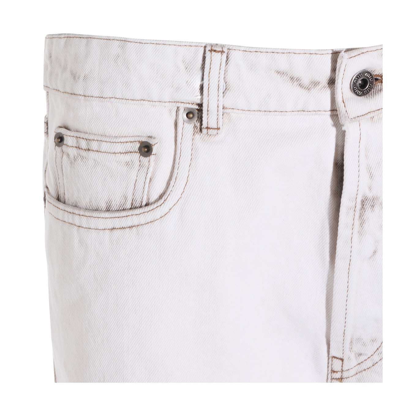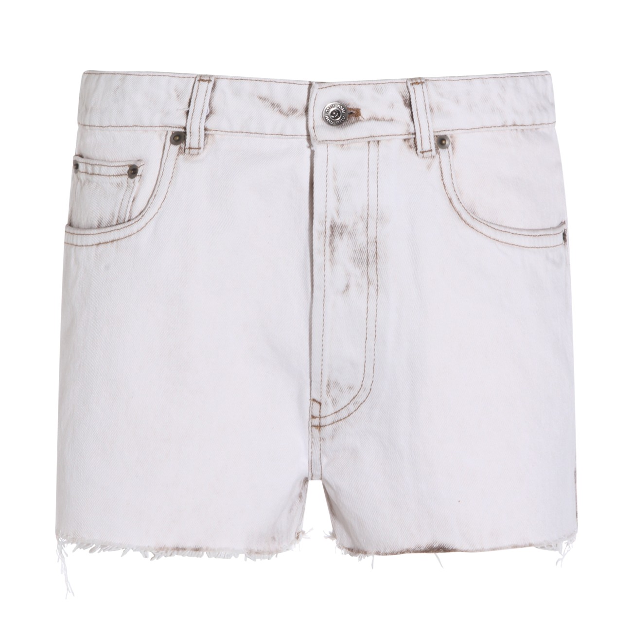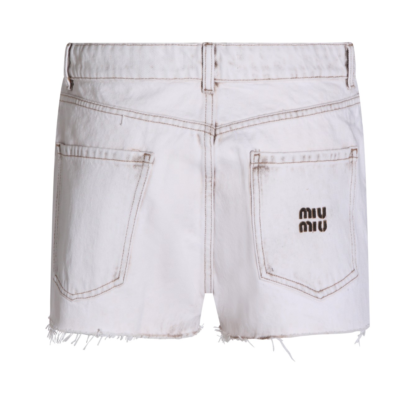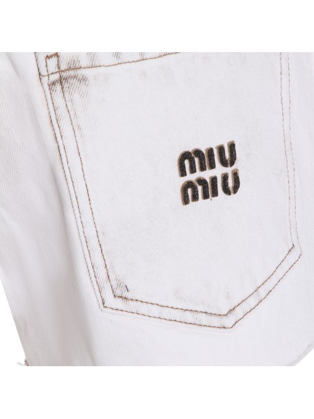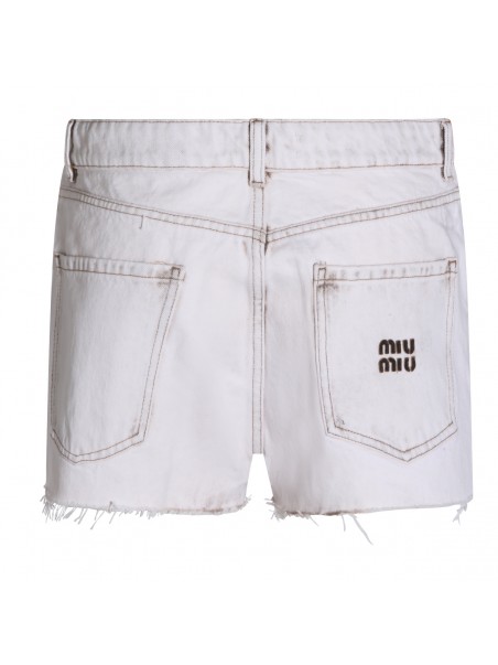 White cotton shorts from Miu Miu featuring frontal fastening, belt loops, pockets, mini length and logo patch.