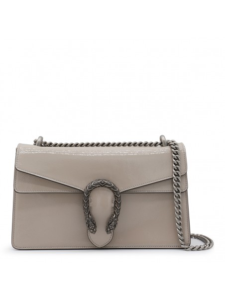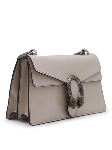 Beige leather Dionysus shoulder bag from Gucci featuring frontal fastening, silver tone hardware, chain, frontal detail, inside pocket and details.