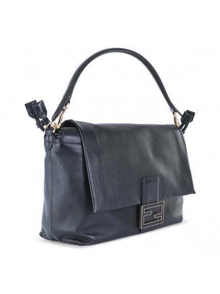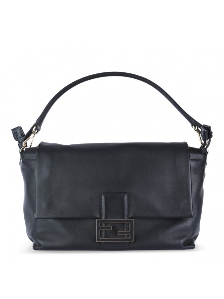 Black leather Mamma Baguette large shoulder bag from Fendi featuring top handle, frontal fastening, lateral drawstring, pocket and frontal logo.